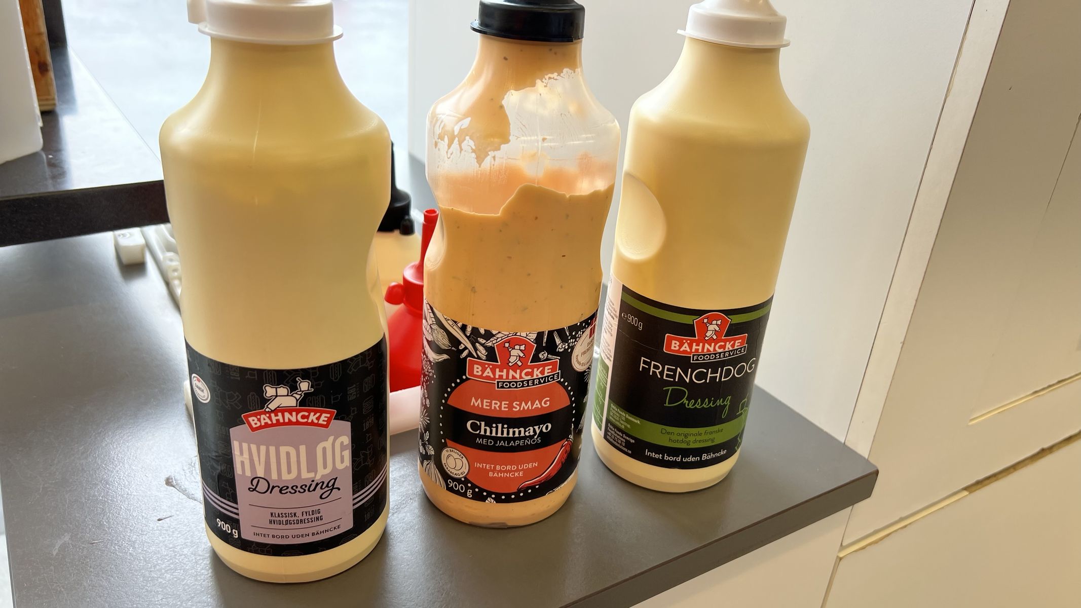 겨자 계열 소스, 매운 마요네즈, 레물라드(remoulade, 향초/겨자등을 섞은 마요네즈 소스). 뒤편에 케첩.