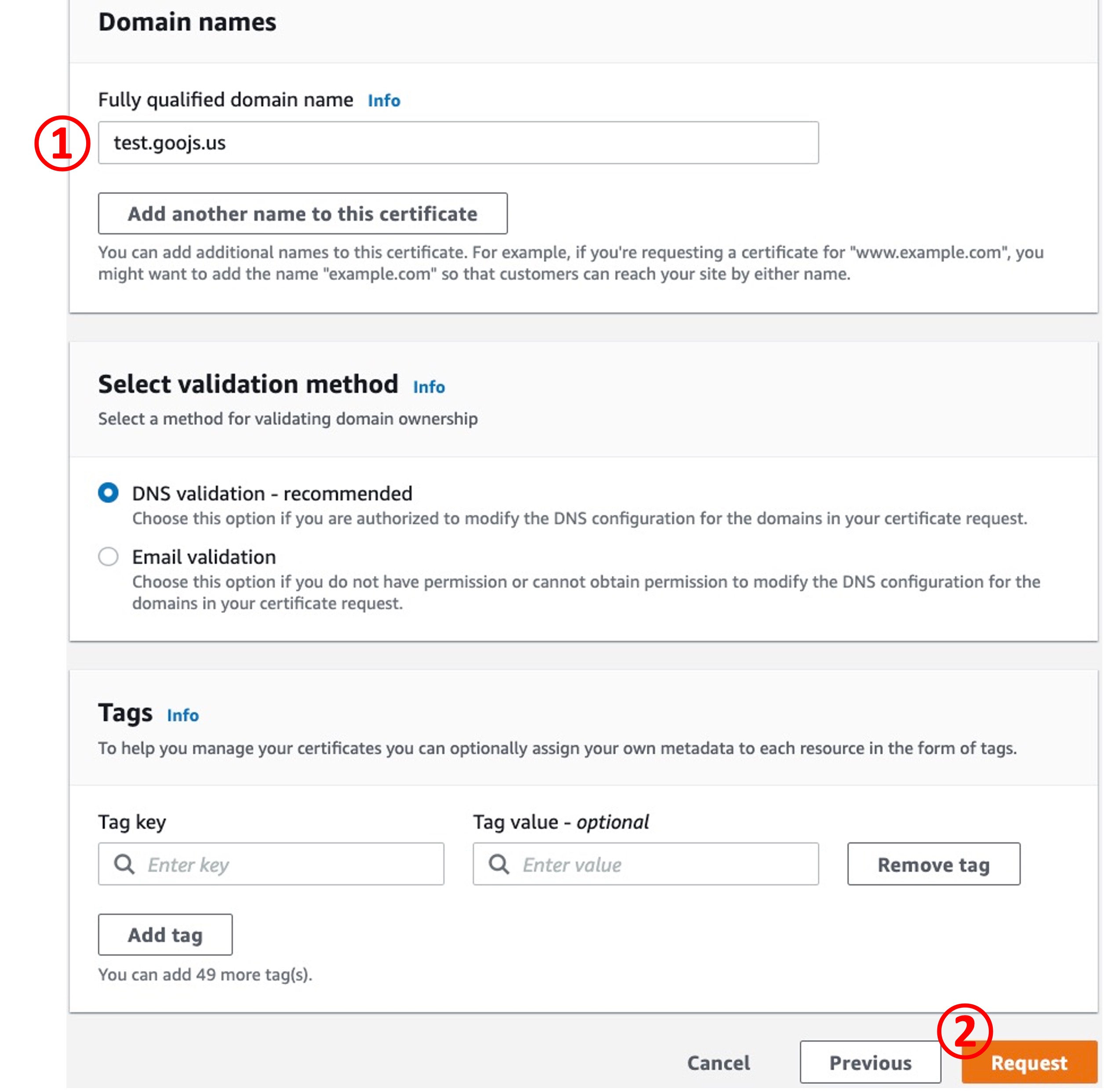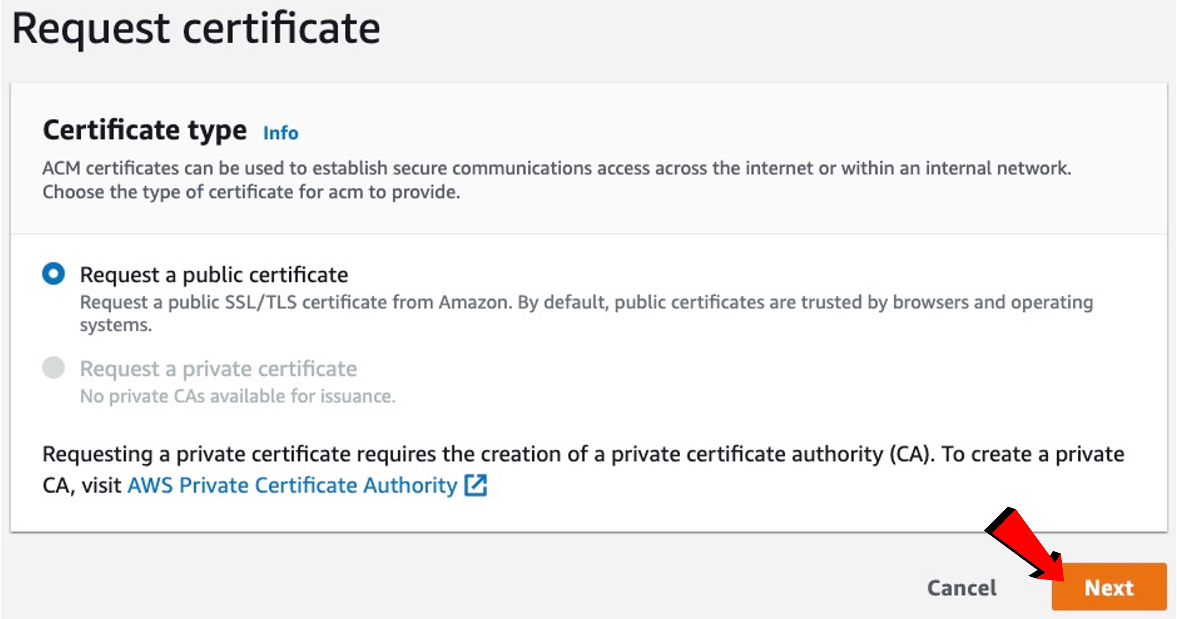 Certificate type을 "Request a public certificate"(default)로 두고 "Next"를 누릅니다.