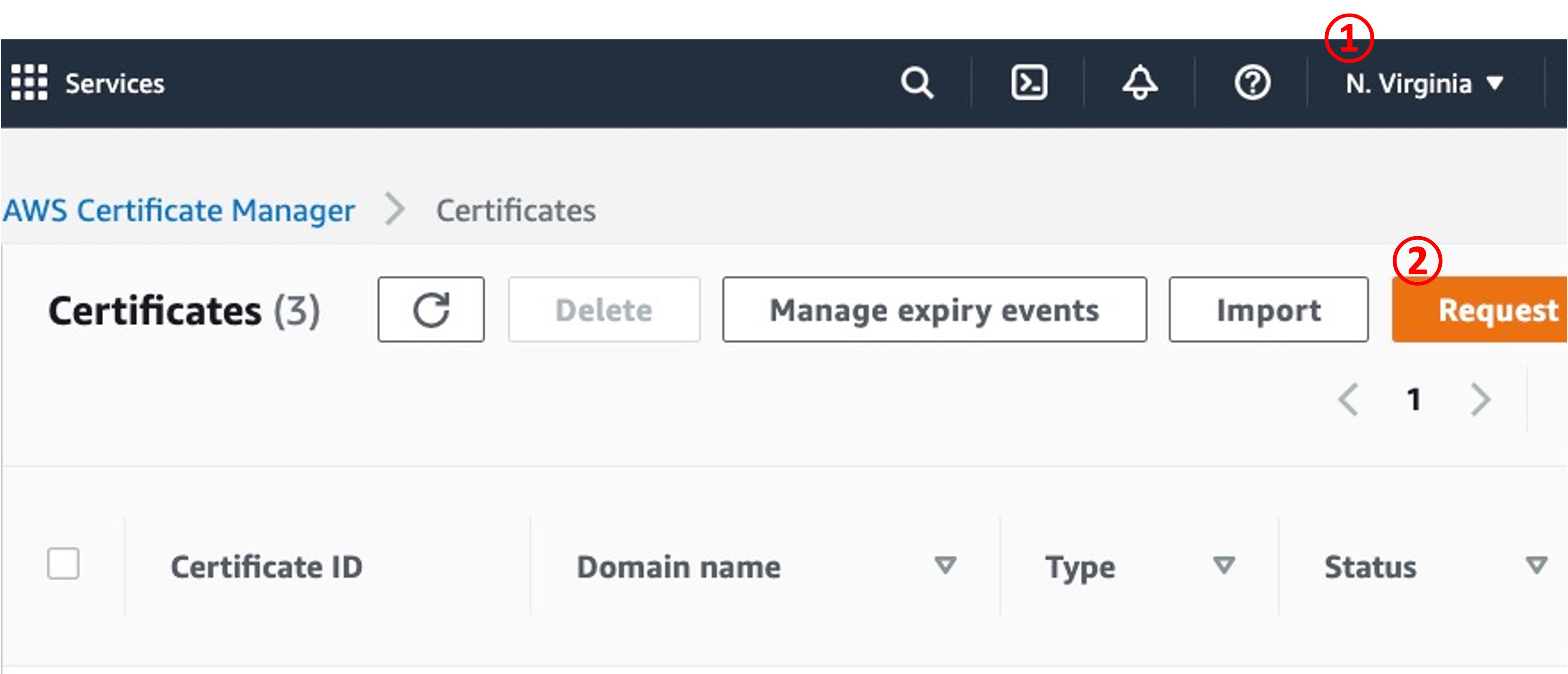 ① server 지역을 확인합니다. CloudFront와 다른 지역에 있는 인증서가 오류를 일으키는지는 확인해보지 않았습니다만, 지역별로 관리가 되기 때문에 다른 지역 서버에서 만든 인증서는 보이지 않습니다.
