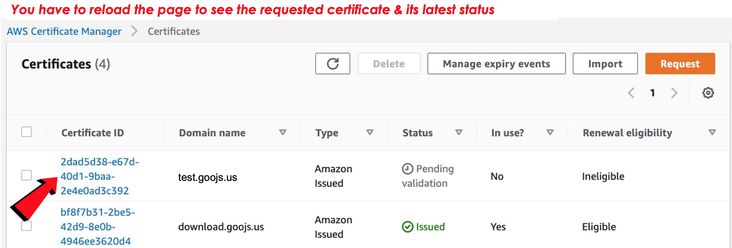 신청이 끝나면 자동으로 AWS Certificate Manager 페이지로 돌아오지만, 새로 신청한 인증서(certificate)를 보려면 페이지를 reload 해야 합니다. 다음 작업을 하도록 하지요. 파란색 "Certificate ID" 리스트에서 새로 신청한 인증서를 누릅니다.