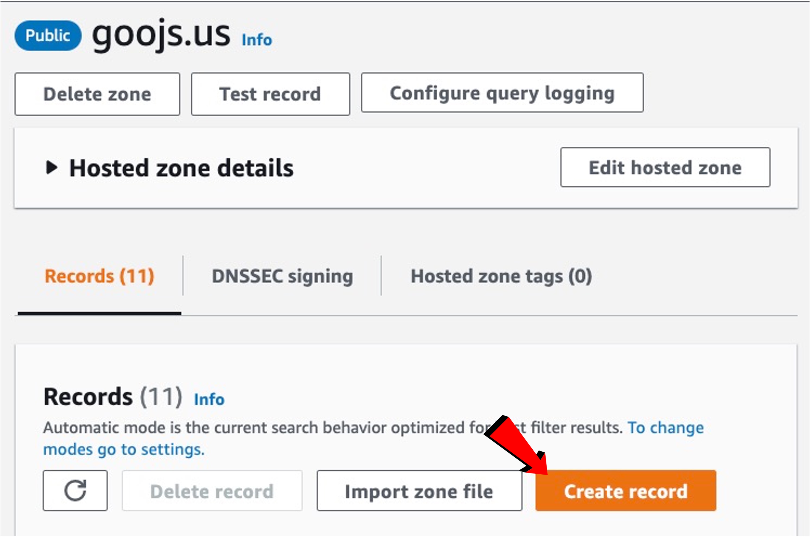 AWS Route 53로 이동합니다. "Hosted Zones" ⇨ 사용하고자 하는 파란색 "Domain Name"을 선택하여 들어간 후 "Create record"를 누릅니다.