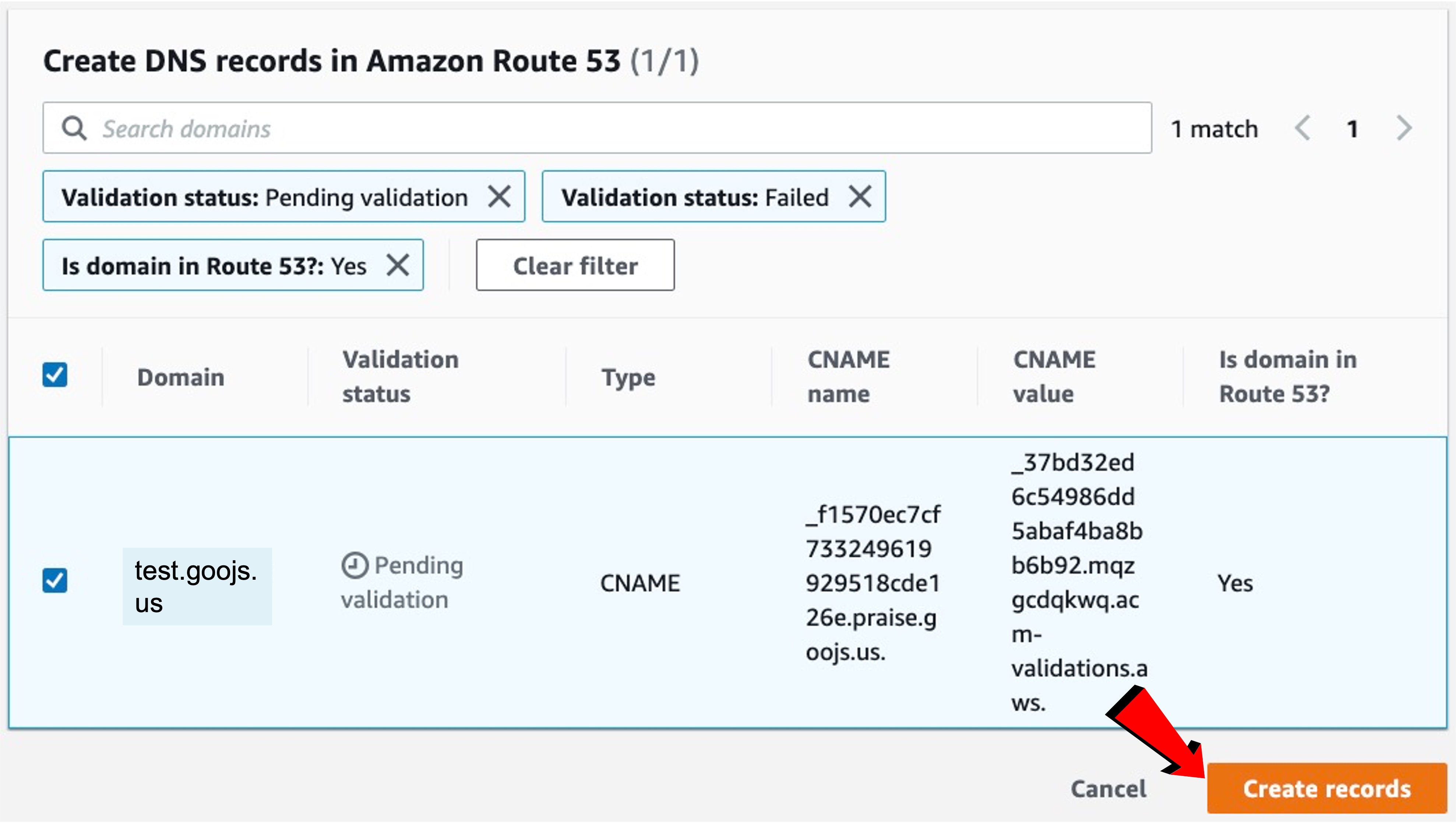 아래쪽에 인증서를 신청한 도메인 이름이 보일 것입니다. 선택하고 "Create records"를 누릅니다.