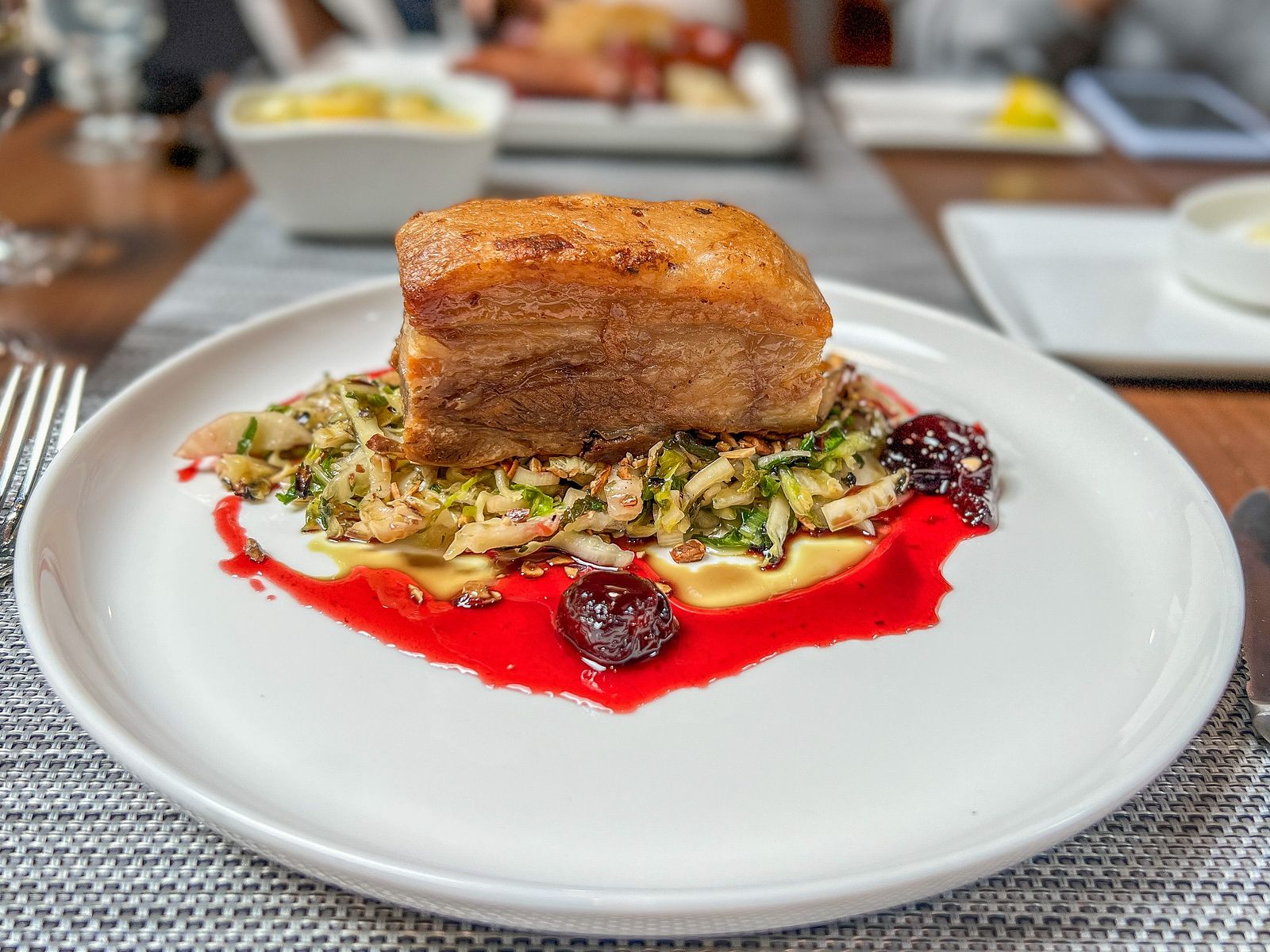 작은 아이가 시킨 삼겹살 구이 (Double Cooked Pork Belly). 삼겹살은 한번 삶은 후에 오븐에 구워낸 것 같습니다. 아래에 양배추외에 무(daikon), 향초(herbs)를 라임-초간장 (lime-soy vinaigrette)으로 양념해서 새콤한 맛을 내고, 거기에 제철 체리(cherry)를 졸여 넣어 단맛을 더했습니다. 이 식당의 대표적인 요리 중 하나인데, 과연 맛의 조합이 훌륭하네요.