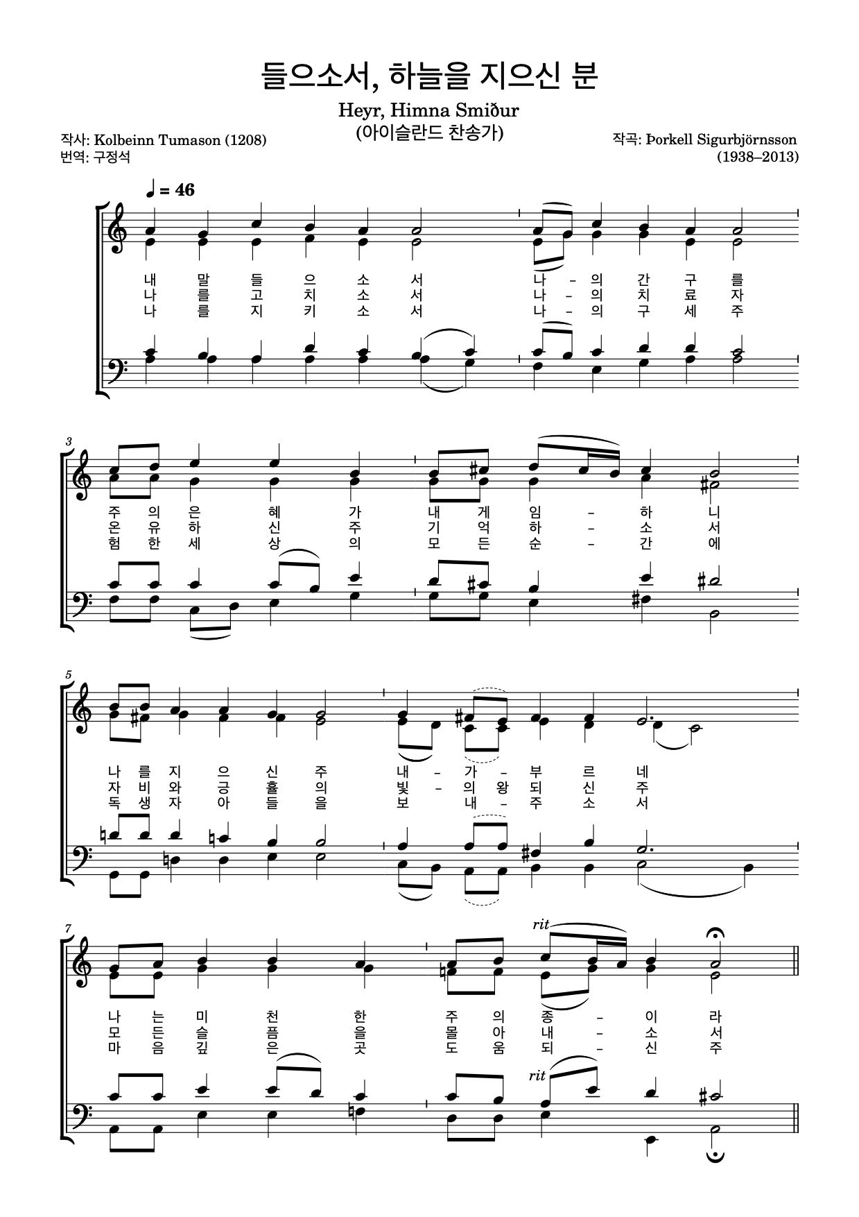 가사와 음율이 너무 아름답고 좋아서 교회 분들과 함께 불러 보았습니다. 전조가 계속 되기는 하지만 음역대는 넓지 않고 평이해서 귀에 익기만 하면 아마추어들도 부르기 어렵지는 않습니다. 호기 있게 아이슬란드 원어로 불러볼 생각도 했으나, 직관적인 것과는 한참 거리가 먼 아이슬란드어 발음을 도저히 따라할 자신이 생기지 않아 한국어로 번역했습니다. 생소한 아이슬란드 곡인지라, 모르긴해도 아마 저희가 이 곡을 한국어로 부른 최초의 사람들이지 않을까 싶네요. 한국어 노래의 특성상 원어 가사의 50~60% 정도 밖에 담지 못한 것을 양해해 주시기 바랍니다.