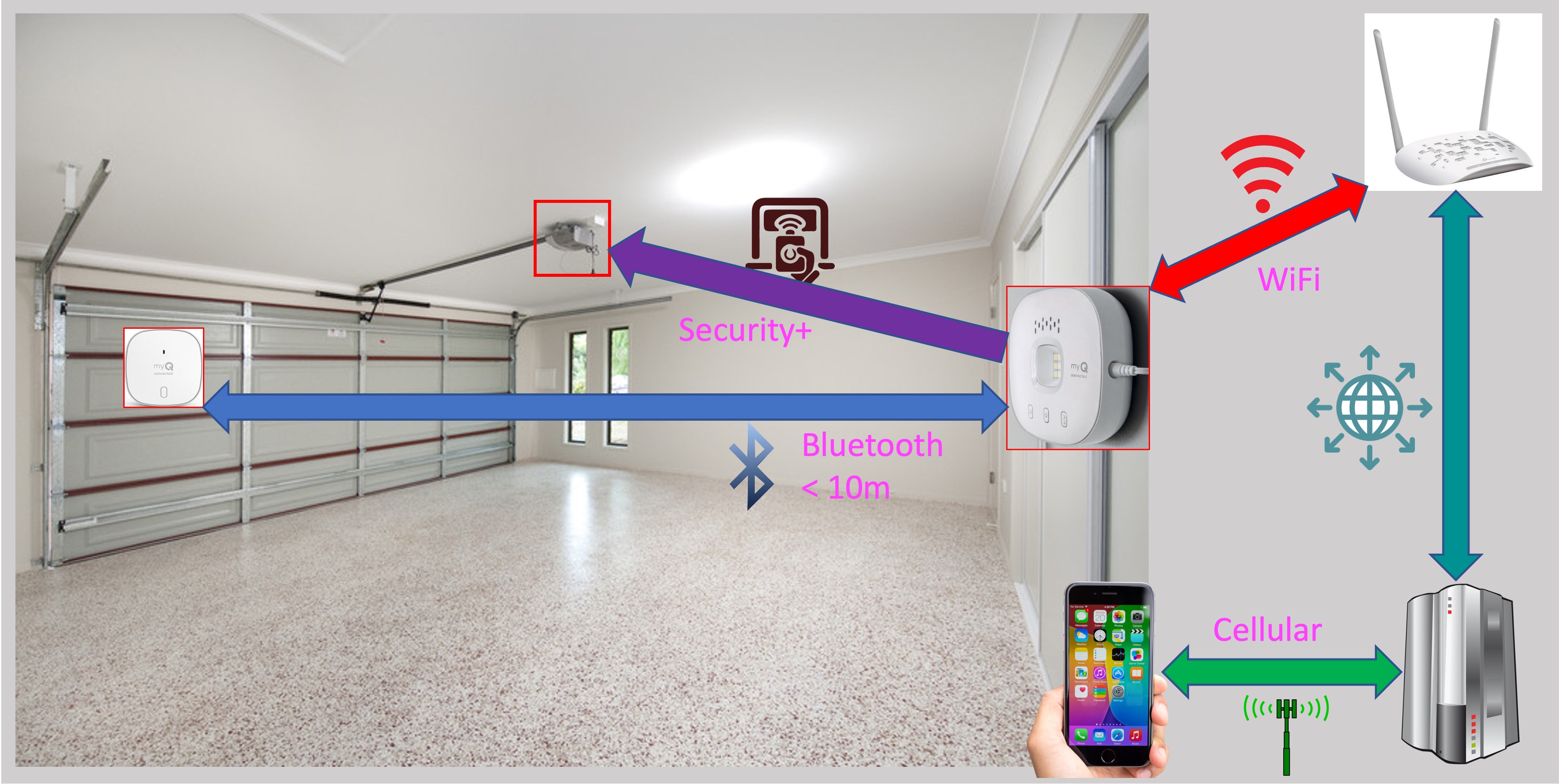 - "허브 (hub) ⇌ 센서 (sensor)"는 2.4GHz 블루투스(Bluetooth)입니다. 센서는 단순히 수직(closed)이냐 수평(open)이냐만을 판단하고 hub로 상태를 전송합니다. 허브의 블루투스는 10m 이내의 근거리용이지만, 주택용 차고(garage)는 엄청 크지 않기 때문에 중간에 가로막는 물체가 없다면 오동작을 할 확률은 높지 않습니다. 제 경우는 7m 정도의 거리입니다.