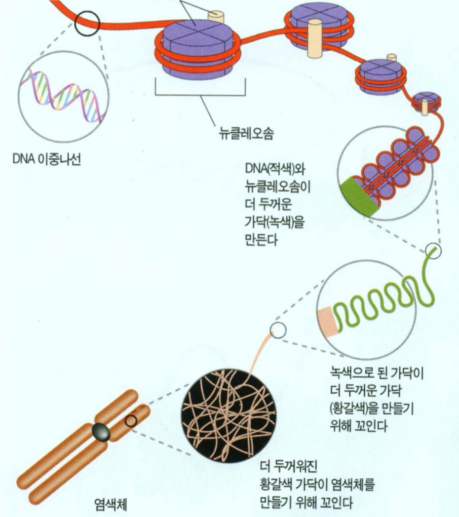 • 히스톤(histone)이라는 단백질의 일종이 얼레(reel) 역할을 하고, 그 주위에 DNA 가닥이 둘둘 말려 있습니다.