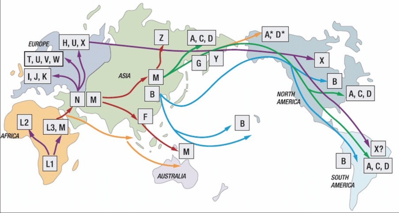 [출처: https://www.researchgate.net/figure/Evolutionary-migration-patterns-of-human-mtDNA-haplogroups-wwwanthropologynet_fig2_29444958]
