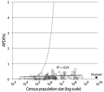 아래 도표는 논문의 p. 20에서 발췌한 것입니다.  Y-축의 APD(Average Pairwise Difference)라는 수치가 개체간의 변이량을 표시하는 것인데 개체수에 비례해 기하급수적으로(exponentially) 증가할 것이라는 기대치(점선)와는 달리 모든 종 (種)의 실제치는 1%이하를 보이고 있습니다. 극히 낮은 계수(R2=0.01)는 x-축과 y-축이 상관 관계가 없음 (uncorrelated)을 나타냅니다.
