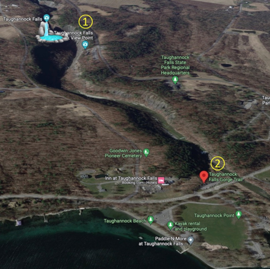 2군데의 위치에서 볼 수 있는데, 거의 걷지 않아도 되는 ① 은 Google Map에서 "Taughannock Falls View Point"라고 검색하면 되고, 왕복 40~50분 정도 걸어야 하는 ② 의 출발지 주차장은 "Taughannock Falls Gorge Trail"이라고 검색하면 됩니다. (아래 3D 지도는 북동쪽에서 폭포쪽으로 본 것)