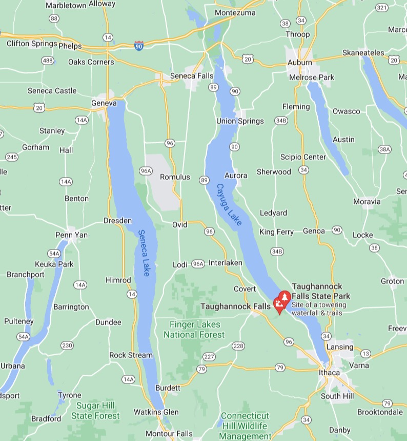 5대호(湖) 중 하나인 온타리오 호(湖)가 그리 멀지 않은 이 지역에는 빙하(glacier)로 인해 형성된 11개의 (지도상으로는 14개인데? 😉)호수가 있는데 손가락처럼 길다란 모양이라서 "핑거 레이크 (Finger Lakes)"라고 부릅니다. 각각의 호수에 붙은 이름은 이 곳에 살던 미국 원주민 (Native American, 혹은 미국 인디언) 부족의 이름에서 유래되었습니다.