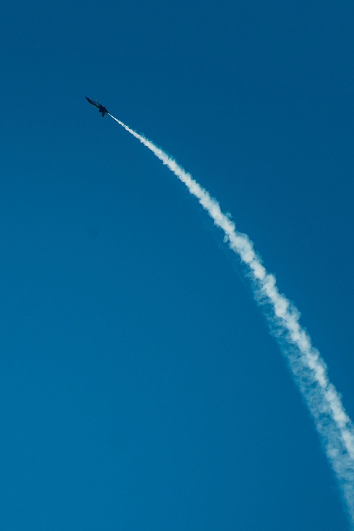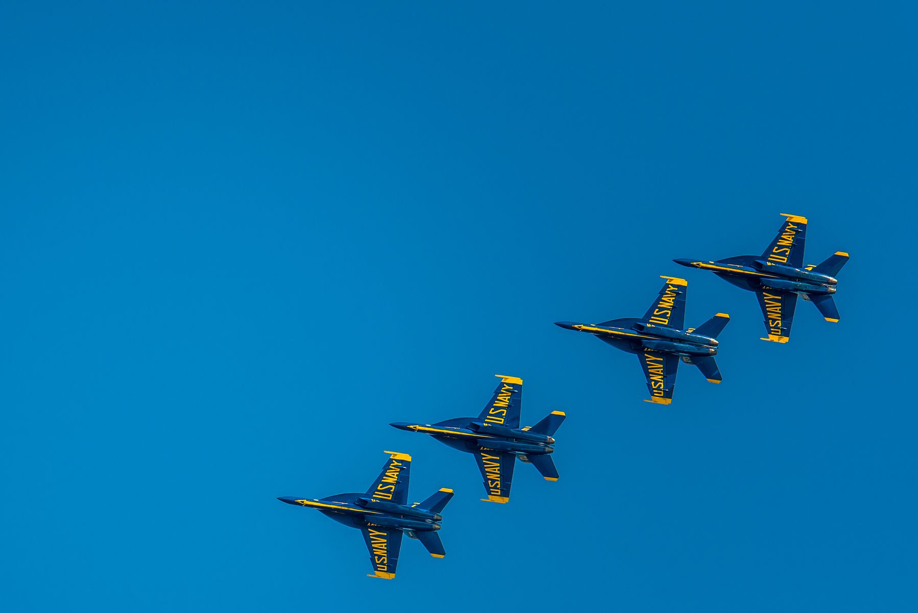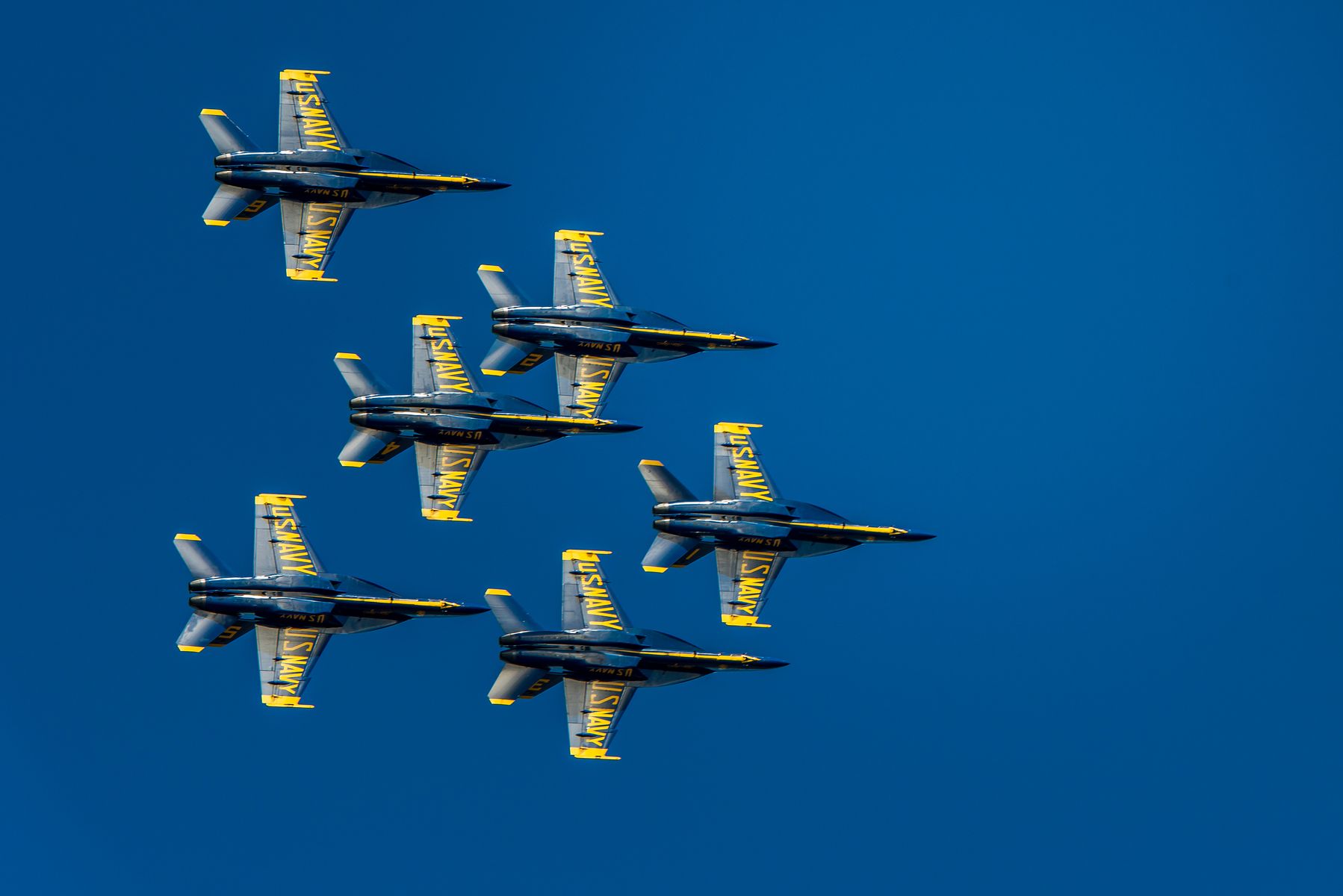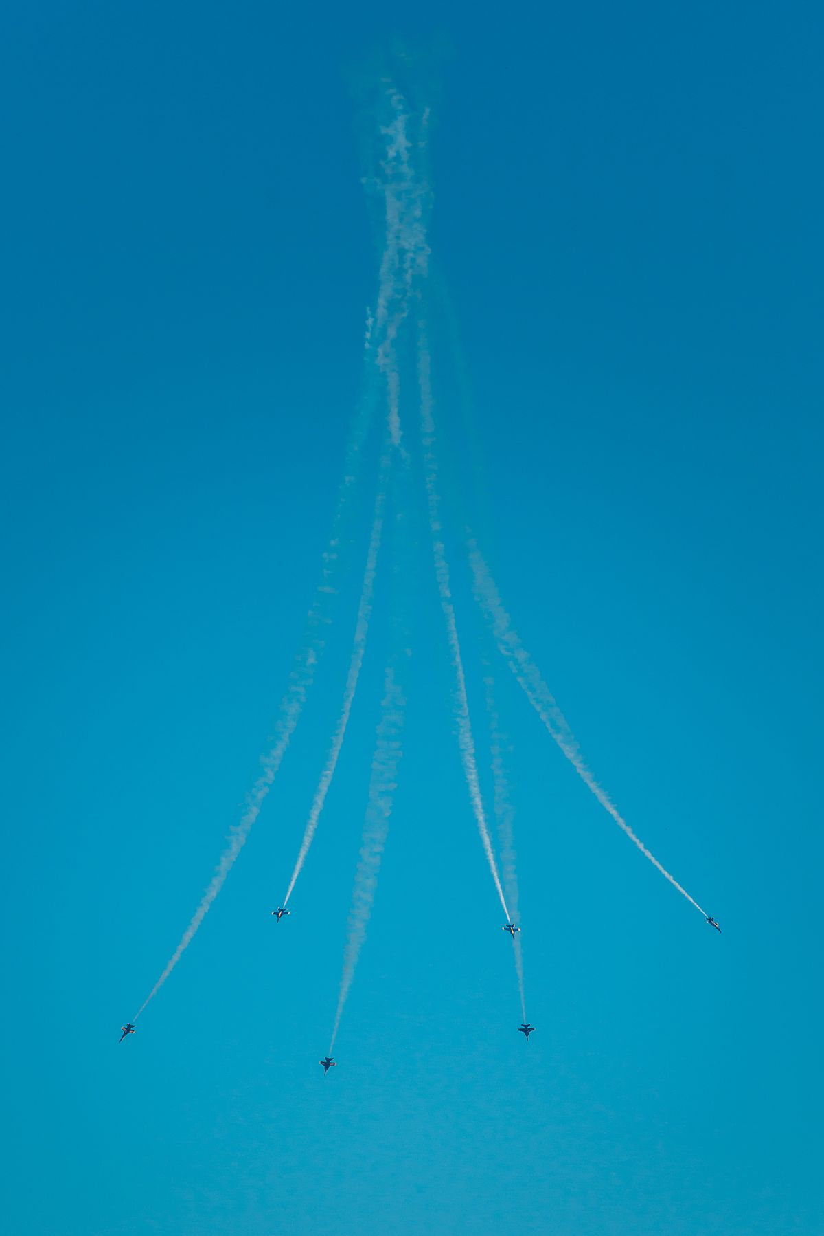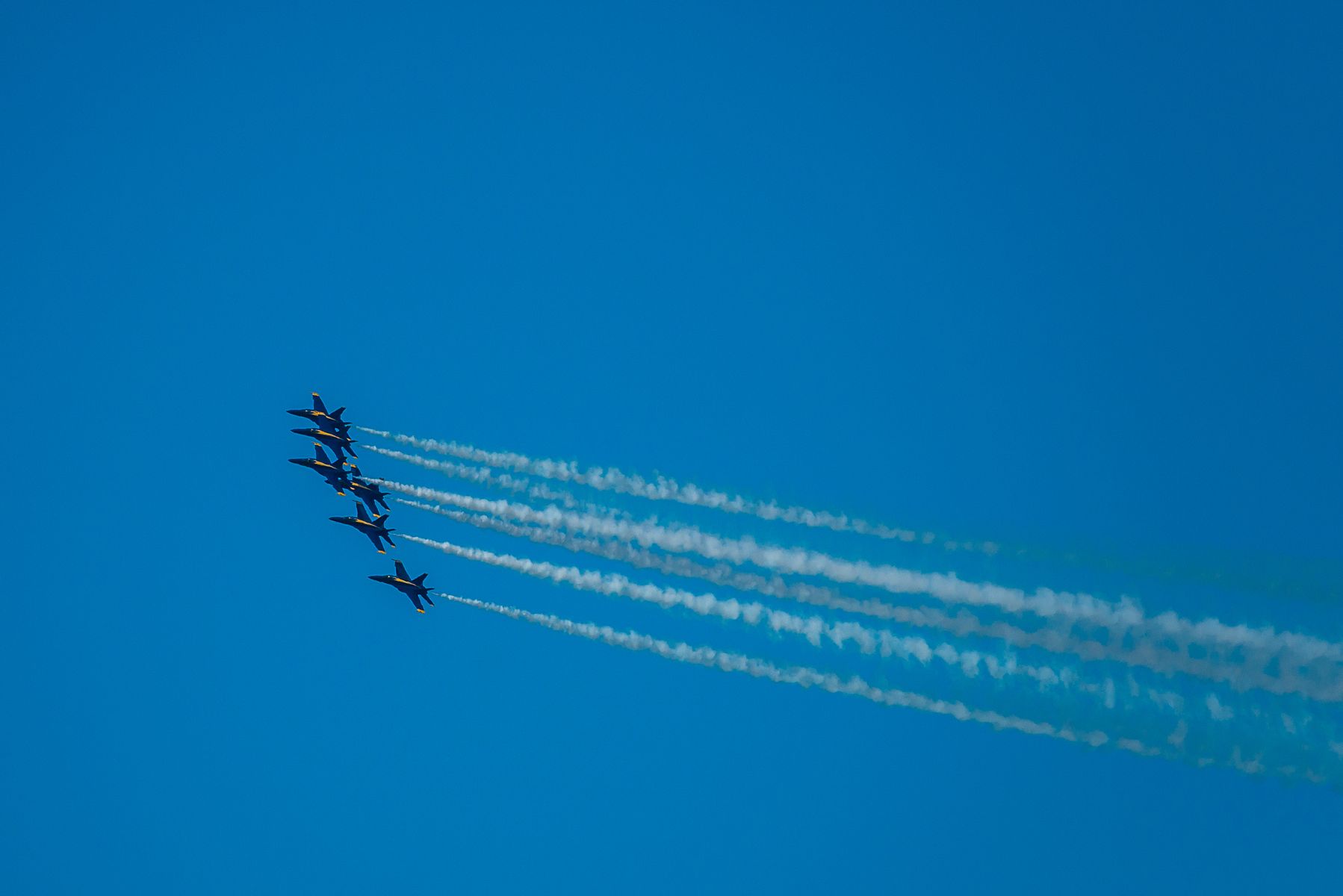 편대를 지휘하는 듯 멀리서 따로 날아다니던 비행기 한대가 하늘로 급상승을 합니다. 이 행사는 미해군 (US Navy) 에서 주관하는 것으로 블루 엔젤스(Blue Angels)라는 곡예 비행팀(flight exhibition team) 창설 40주년인 1986년부터 F/A-18 Hornet을 사용하다가, 75주년인 2021년부터 보잉(Boeing) F/A-18 Super Hornet이 사용되고 있습니다. 바로 2022년 개봉된 탐 크루즈(Tom Cruz) 주연 탑건 2 (Top Gun: Maverick's)의 작전에 사용되었던 그 전투기지요. 최대 비행 속도 마하 1.6 (시속 1,976Km)으로 저렇게 급상승하거나 최소 반경으로 회전하면 7.5G (중력의 7.5배)에 달하는 엄청난 압력으로 최고의 기량을 가진 조종사들도 영화에서처럼 혼수상태에 빠질수 있습니다.