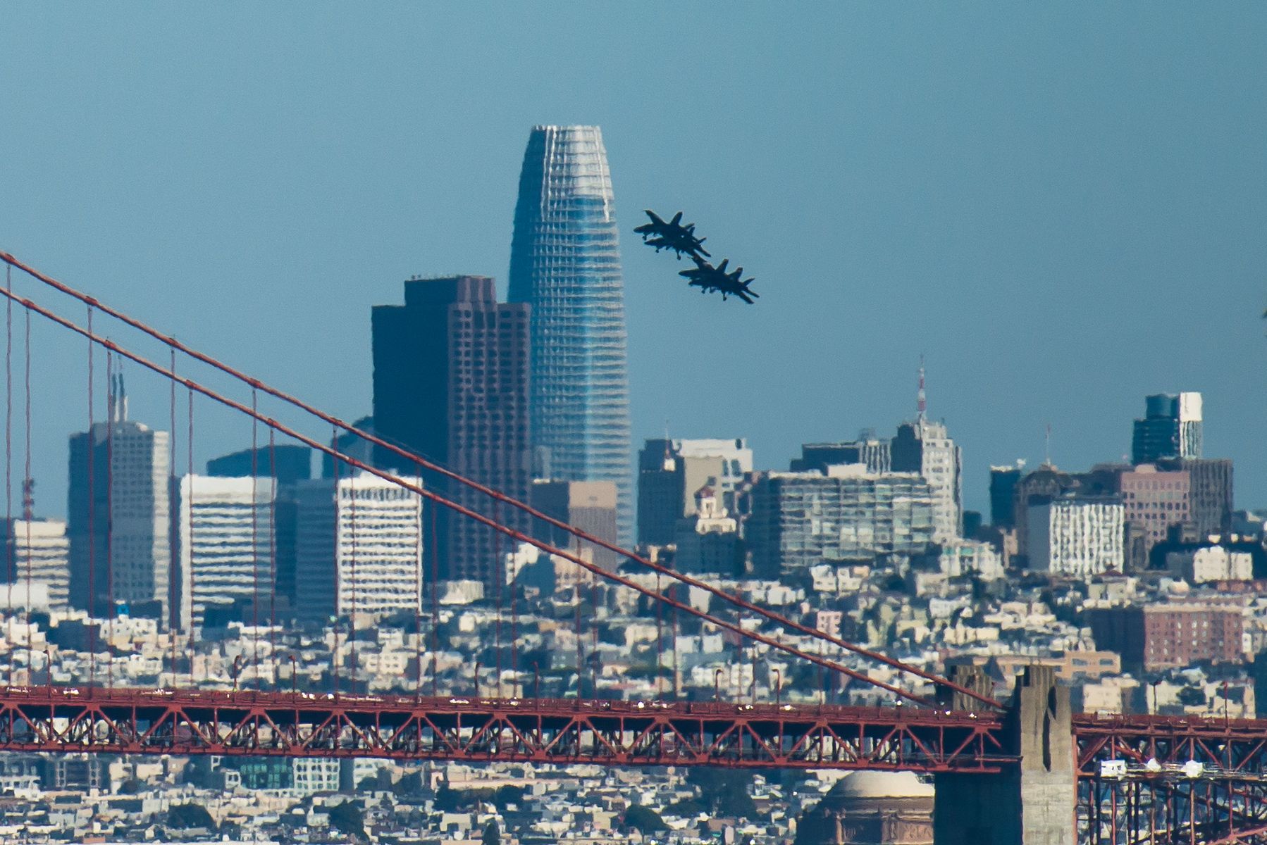 샌프란시스코 시내에서 가장 높은 곳이 트윈 픽스(Twin Peaks)라는 언덕이고, 그 부근에 수트로 타워(Sutro Tower)라는 방송 안테나가 있는데 그 위로 전투기 4대가 지나가고 있습니다.