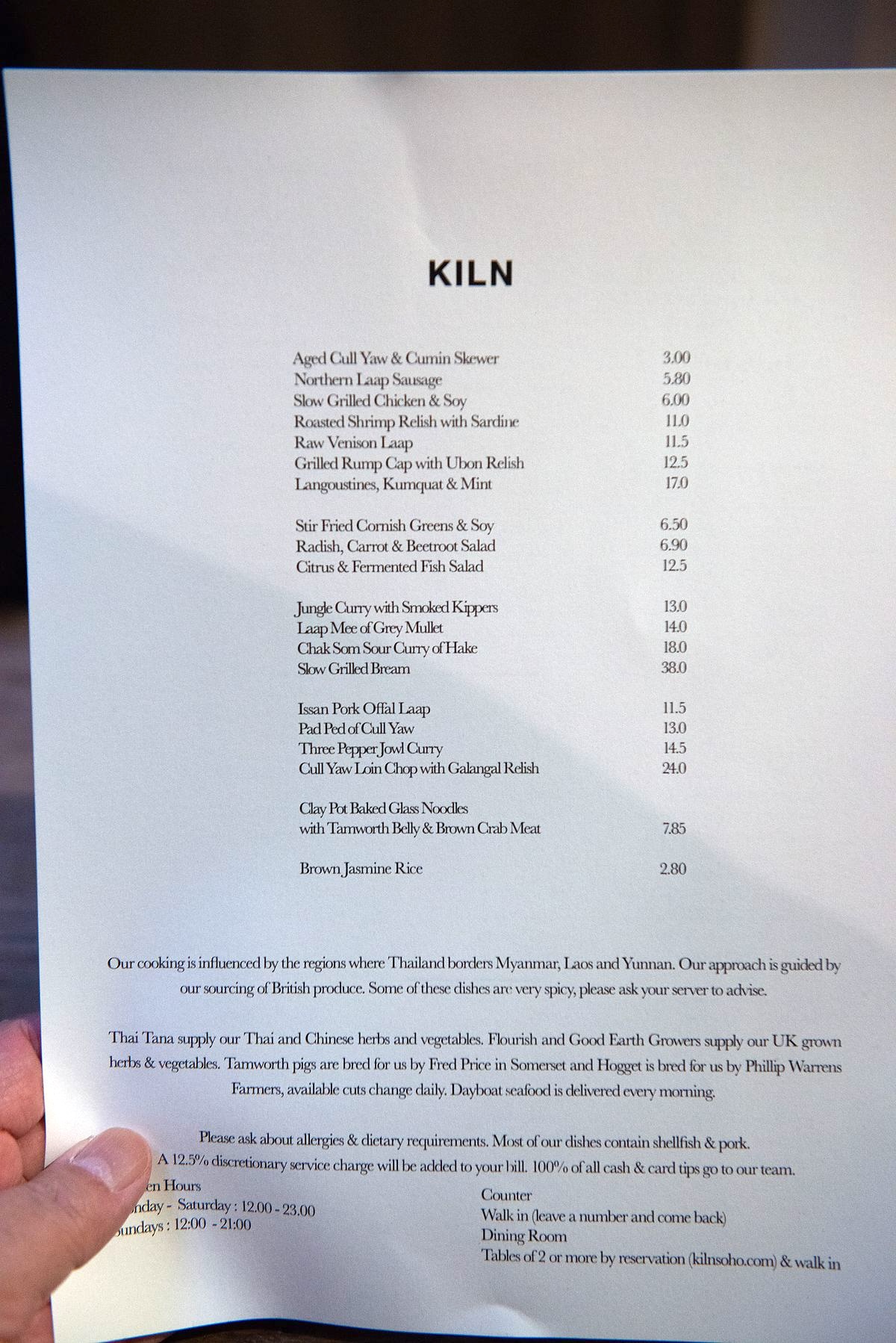 런던 여행 떠나오기 전에 점심/저녁 식사할 곳의 80% 정도를 예약 해놓고 왔는데 이 식당 Kiln이 예약한 첫번째 식당입니다. 식당 이름 킬른(Kiln)은 벽돌 같은 것을 구워내는 가마라는 뜻입니다. 엣날에는 'n'이 묵음이라 kill과 같은 발음이었다가 지금은 킬른으로 읽는다고 합니다. Central London의 Soho 지역 남쪽 Piccadilly Circus 역 부근에 있어요. (메인 가격대 £12~38, 맛 8.5, 가성비 8.5, 인테리어 7.0)