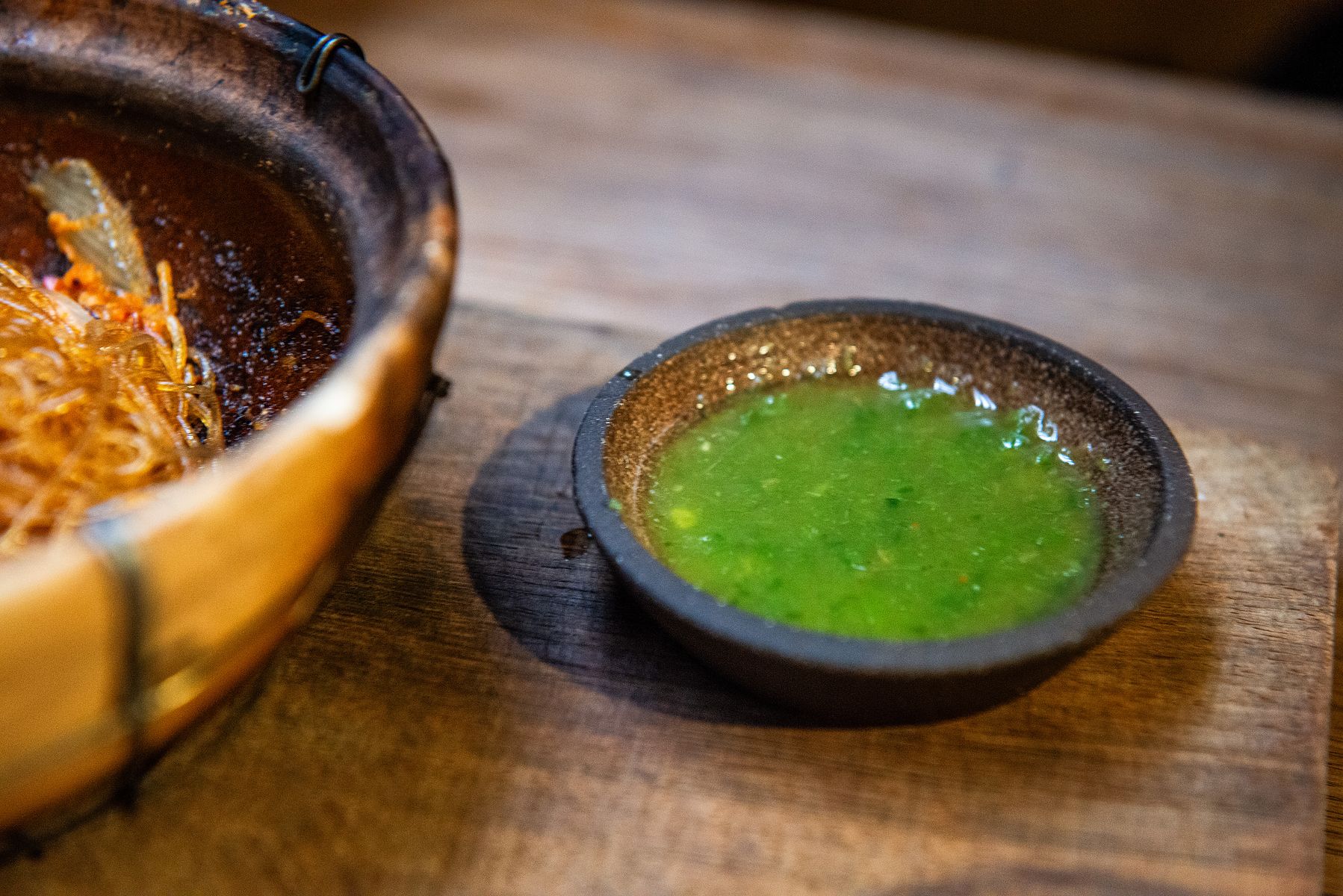 느끼한 맛을 잡아주는 얼큰한 풋고추 소스.