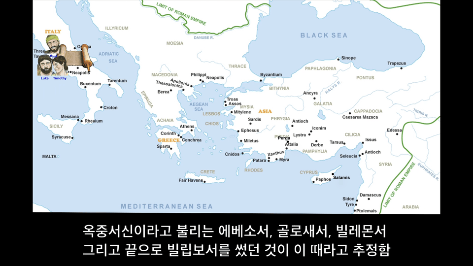아마도 AD 58에서 60년까지 바울은 로마 하숙집에서 재판을 기다리며 가택연금 상태로 있었고, 그 기간 동안 자신을 방문하는 사람들마다 다 따뜻하게 맞아들이며 복음을 전했습니다. 소위 옥중서신이라고 불리는 에베소서, 골로새서, 빌레몬서 그리고 끝으로 빌립보서를 썼던 것이 이 때라고 추정됩니다.