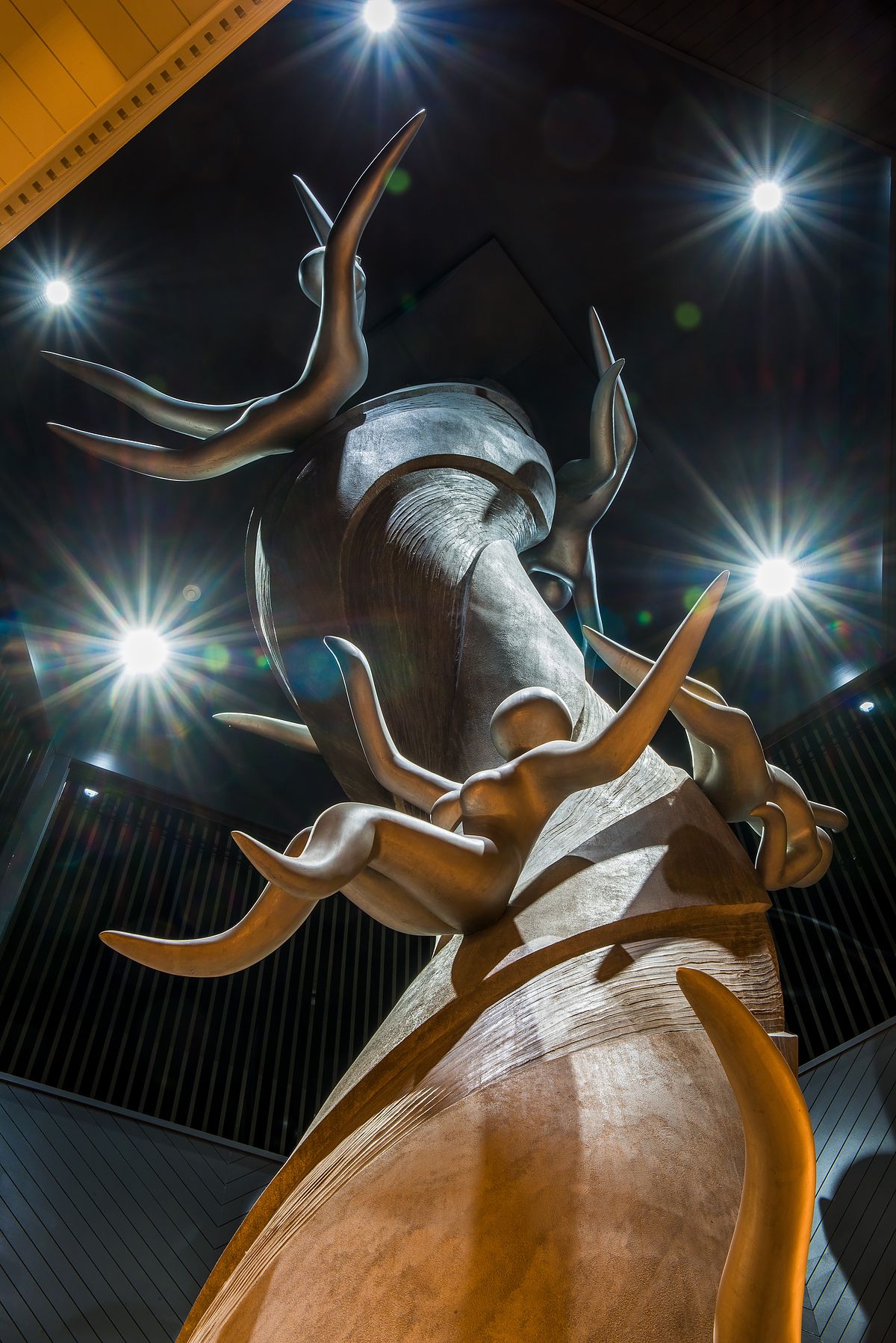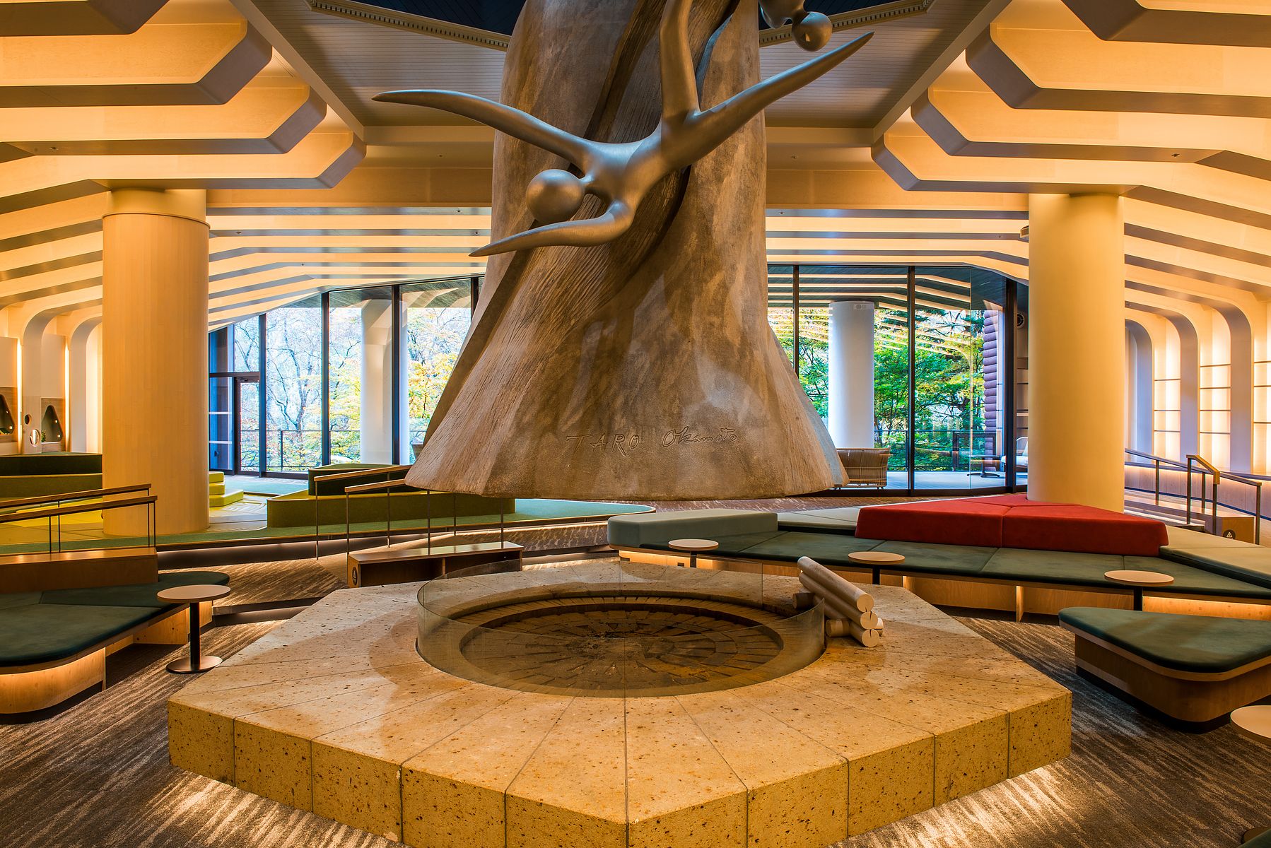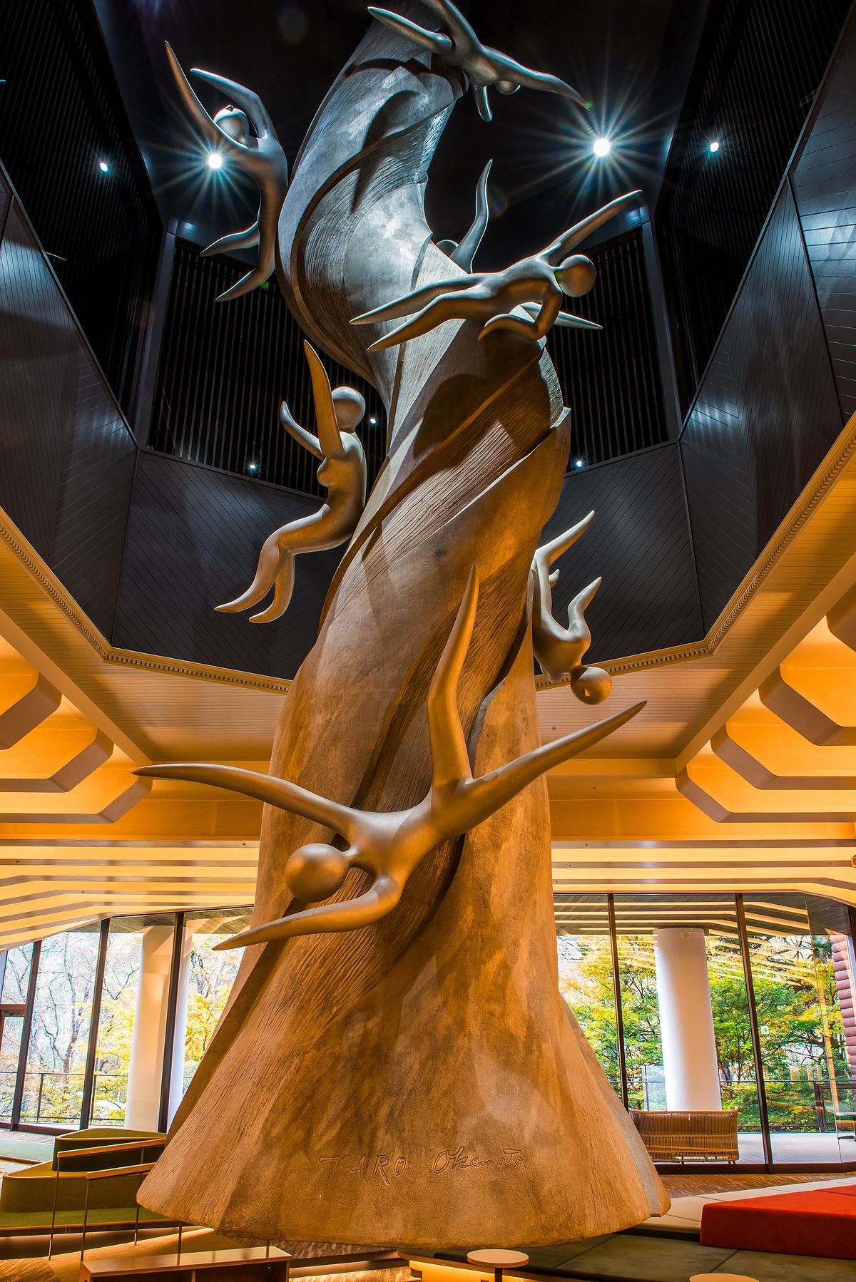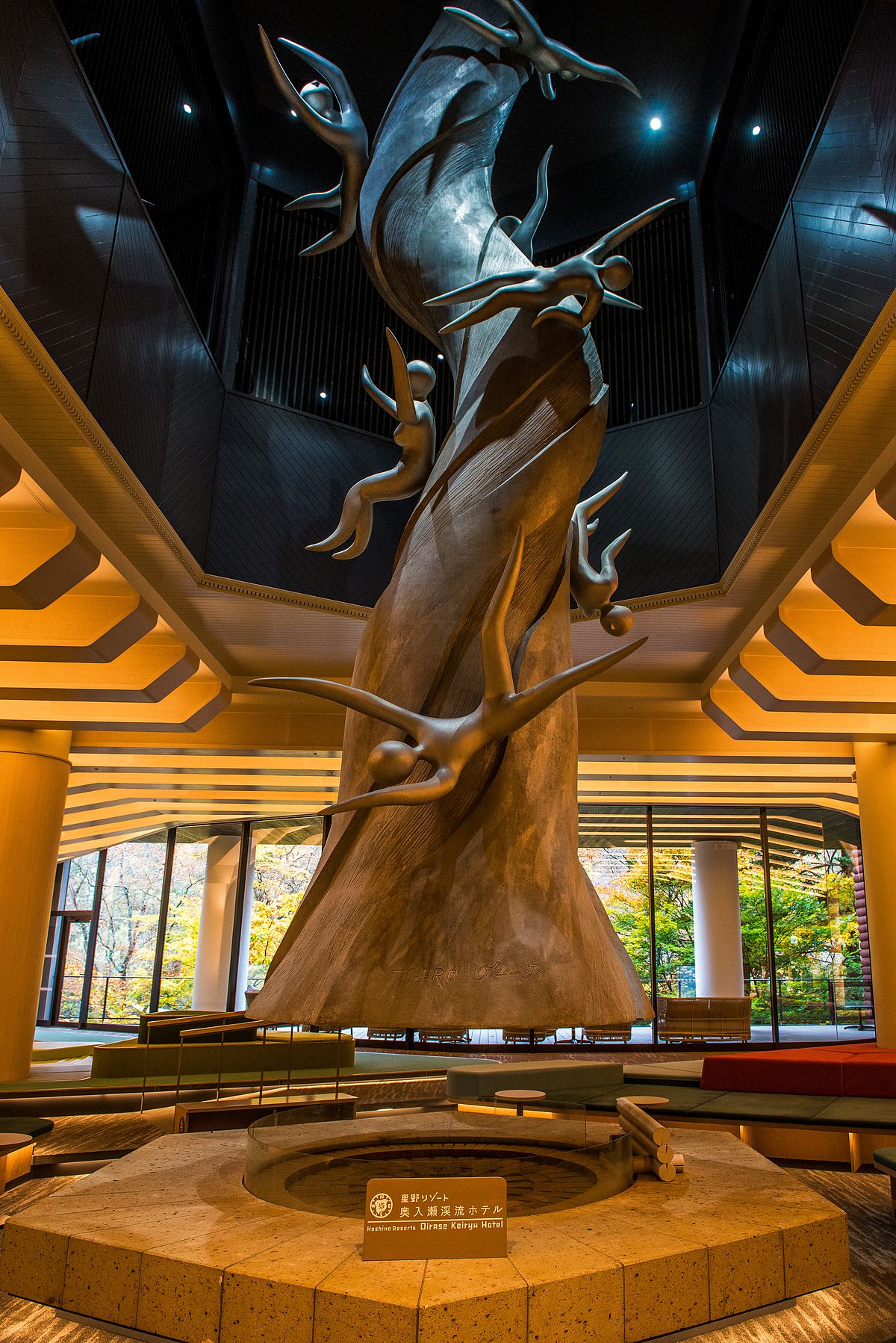 이 로비(lobby)에는 오카모토 타로(岡本太郎, 조각가, 화가, 사진가, 도예가, 1911.2.26~1996.1.7)가 만든 또 하나의 청동 오브제(objet)가 있습니다. 무려 높이 10m에 무게 7t으로 동관(東館)의 작품 「숲의 신화 (森の神話 모리노 신와)」 보다도 더 크고 육중한 이 작품의 제목은 「물의 신 (河神 카신)」으로 계곡의 흐르는 물 줄기를 타고 즐겁게 노는 일곱명을 묘사하고 있습니다. 이 거대한 오브제(objet)들을 건물 안에 위치시키기 위해, 먼저 작품들을 설치한 후 그것들을 중심으로 리조트 건물이 지어졌다고 하네요.