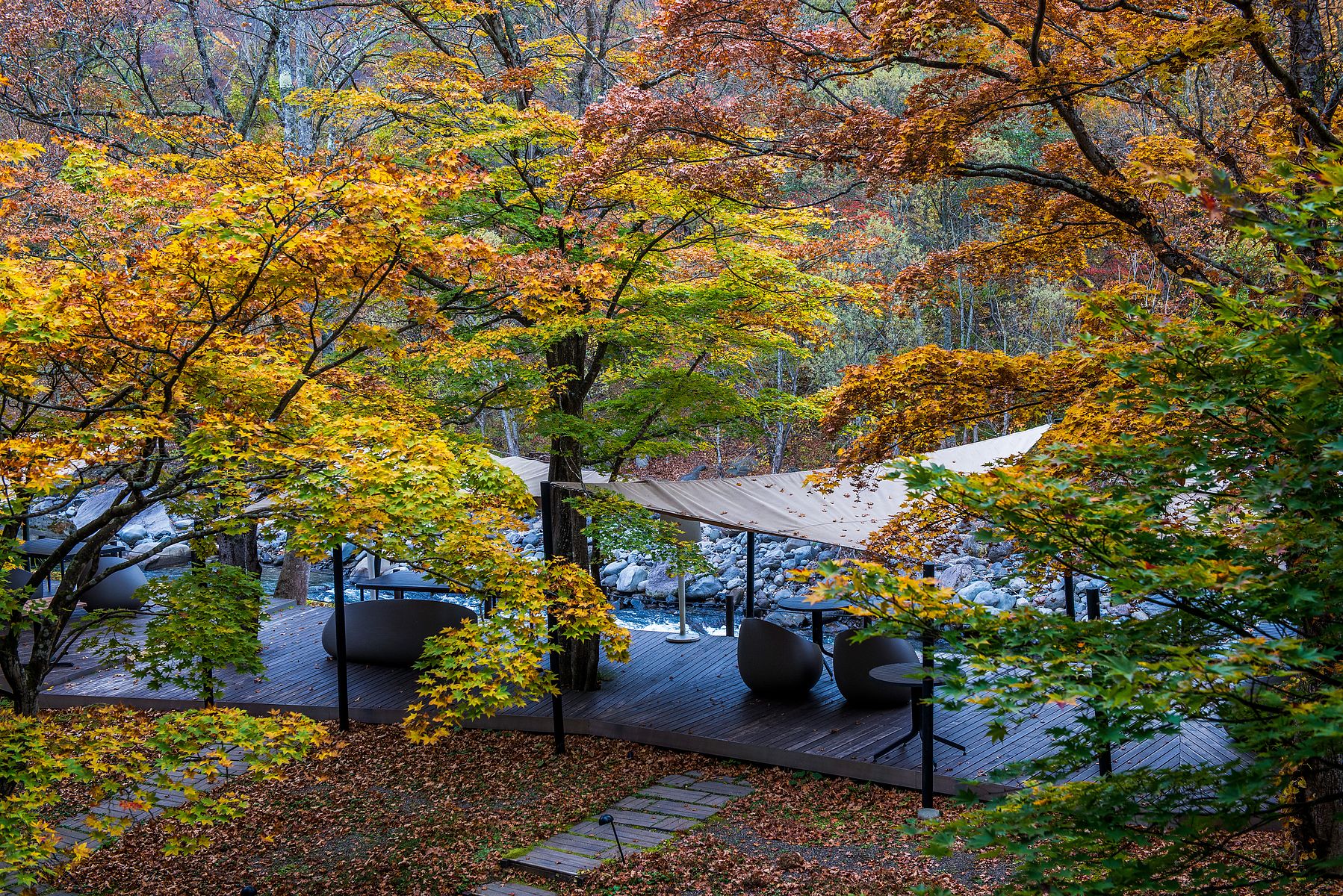 "세세라기 데크 (せせらぎ deck)"에서 내려다 보는 뒷뜰의 풍경.