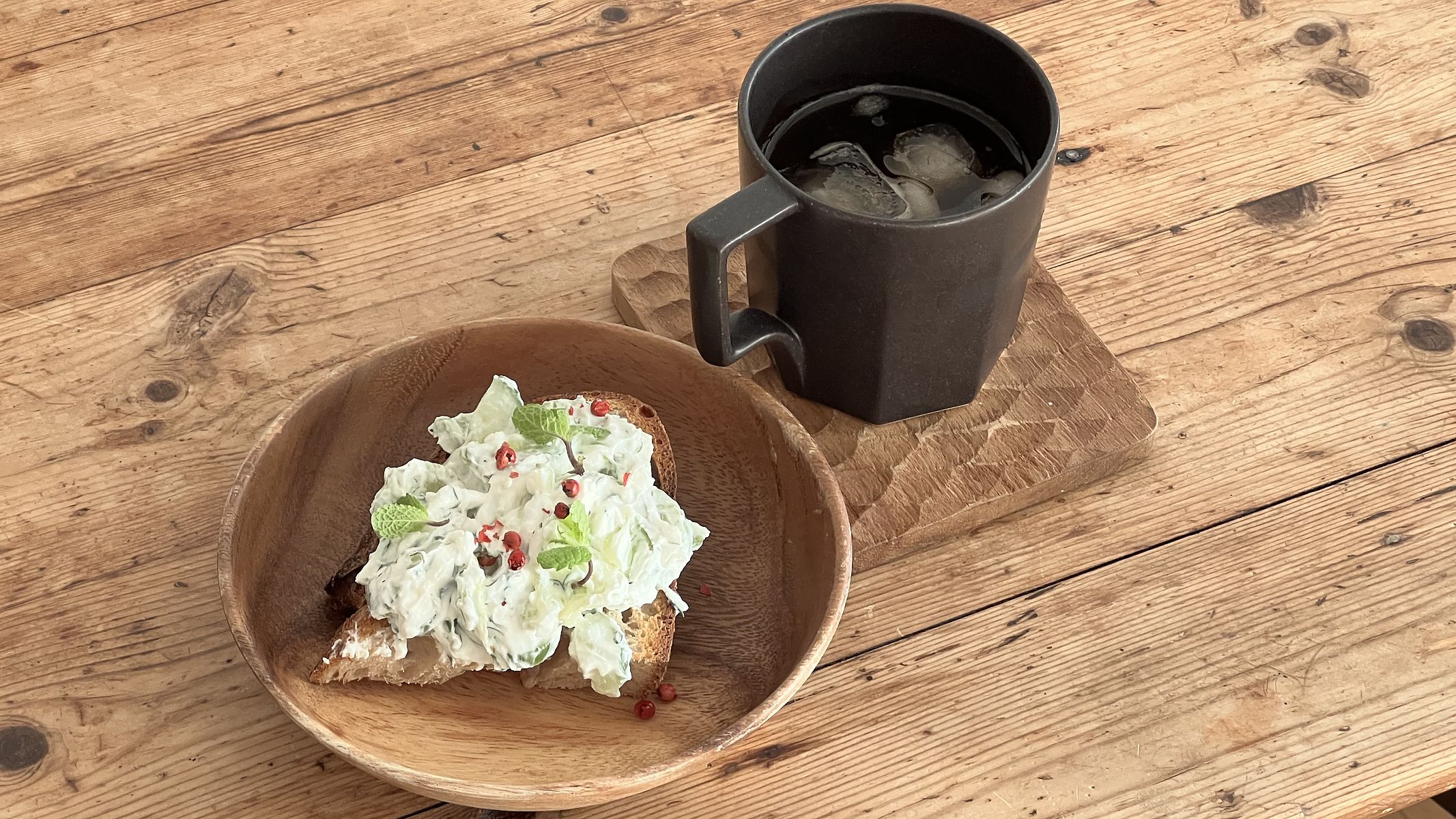 아침 안 먹은지 시작한지 한참 되었다 하니 간단하게라도 먹으라고 천연효모 빵 한조각에 오이 넣은 Greek yogurt 얹고, hand dripped iced coffee 한 잔 주심.