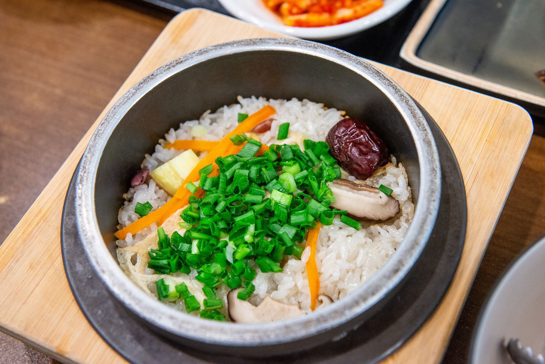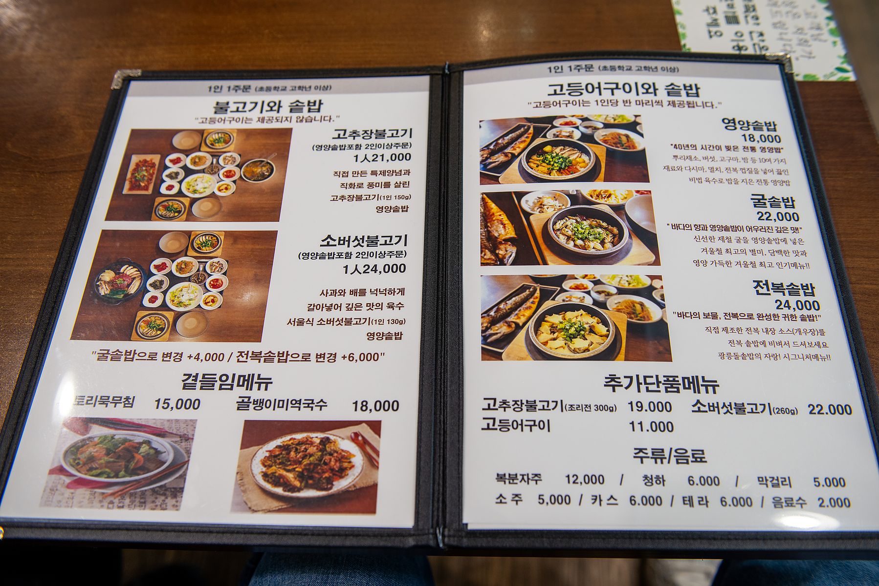 식당 이름대로 개인별 솥밥이 주 메뉴이고 돼지 불고기, 소 불고기, 고등어 구이등과 세트 메뉴들이 있습니다.