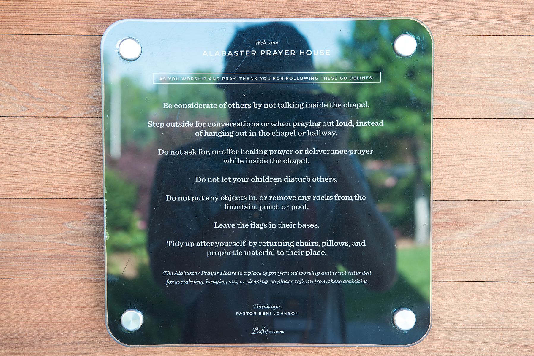 기도실 밖에는 작은 인공 연못이 있고, 주변 정원에는 아몬드 (almond), 석류 (pomegranate) 나무 등 성경에 나온 식물 중 캘리포니아에서 자라는 나무들이 심겨져 있습니다.