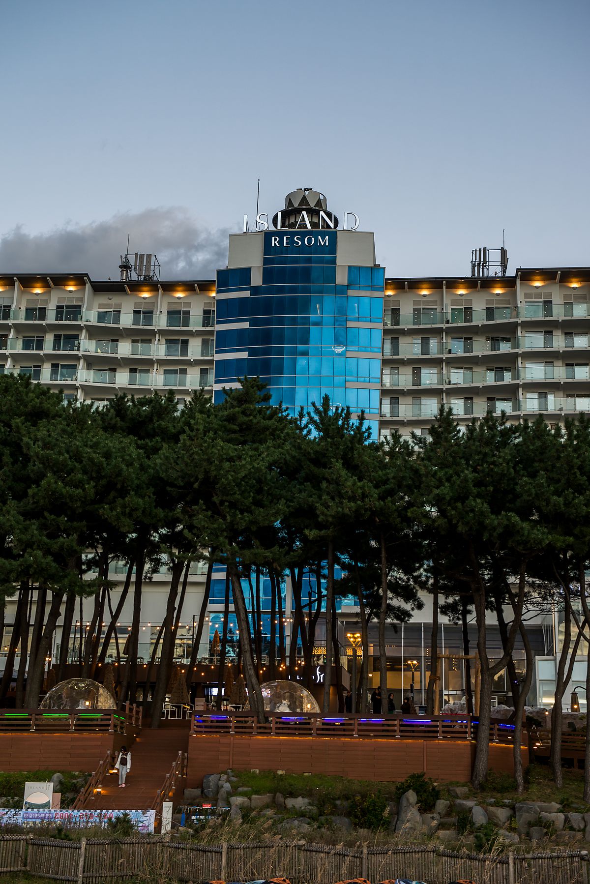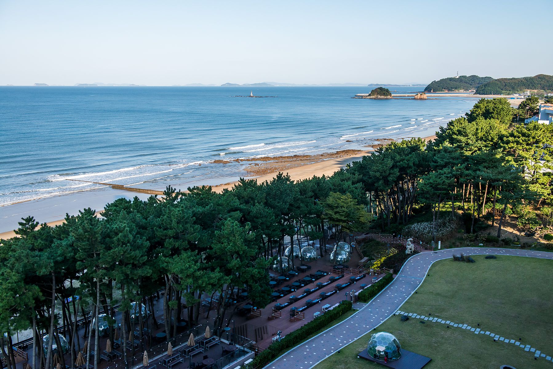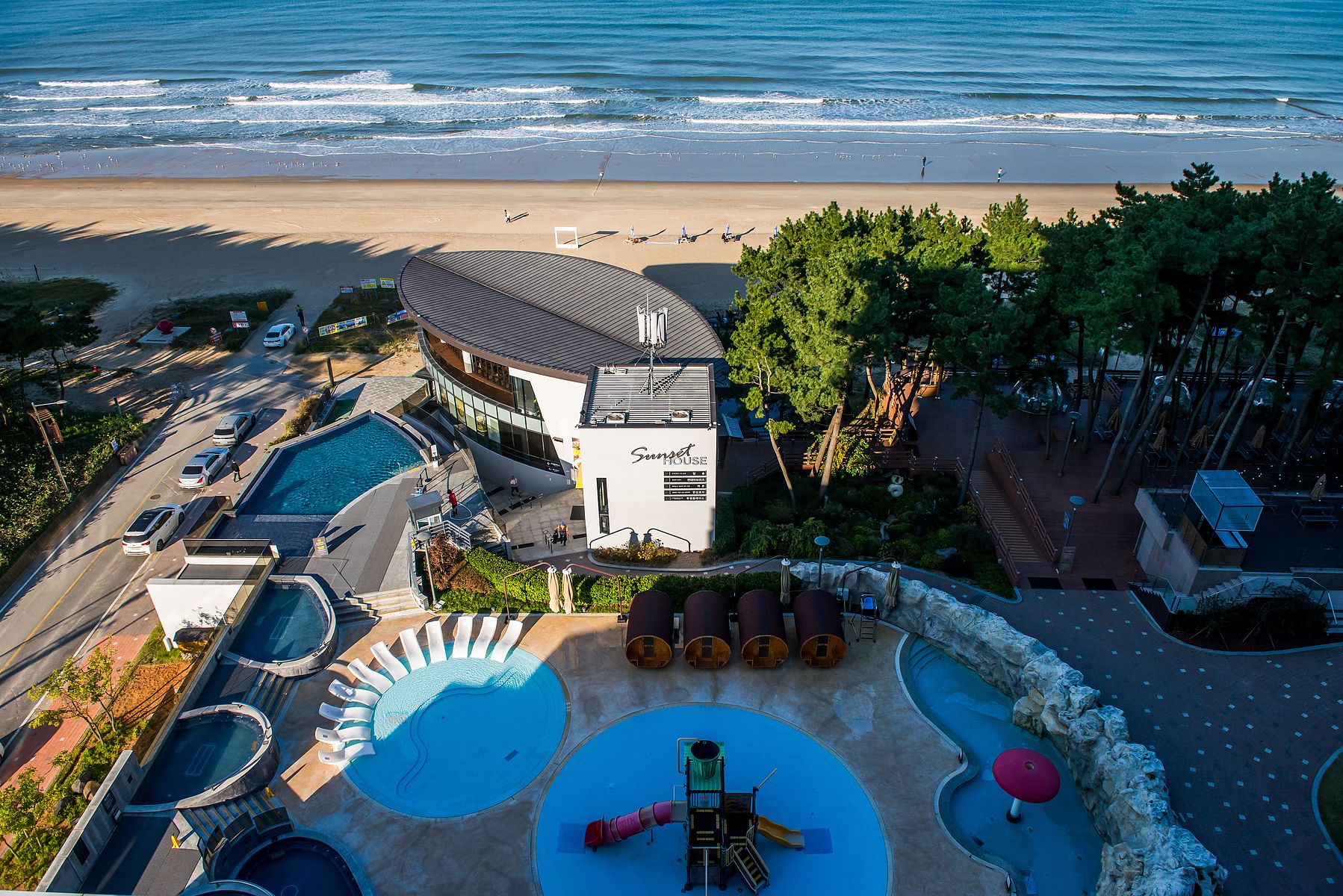 바다쪽 방에서 내려다 보는 호텔의 풍경입니다. 물 놀이 시설과 따뜻한 물 스파(spa)가 있고, 소나무숲(松林) 에는 겨울에 따뜻한 곳에서 석양을 볼 수 있는 투명 이글루(egloo) 를 설치했네요.