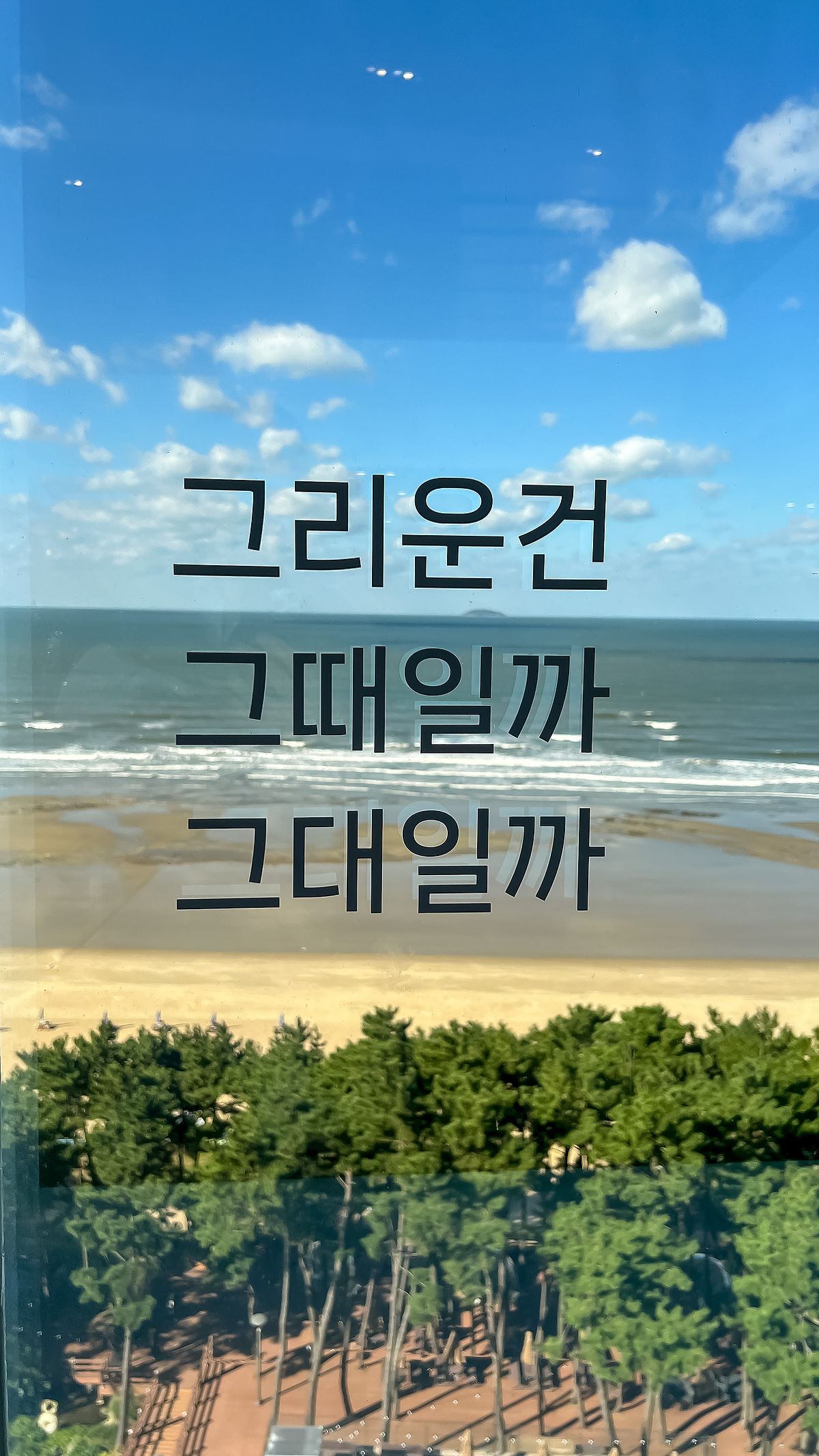 각 층 엘리베이터 옆에 바다를 향한 큰 창문이 있고, 여러 문구들이 적혀 있습니다.