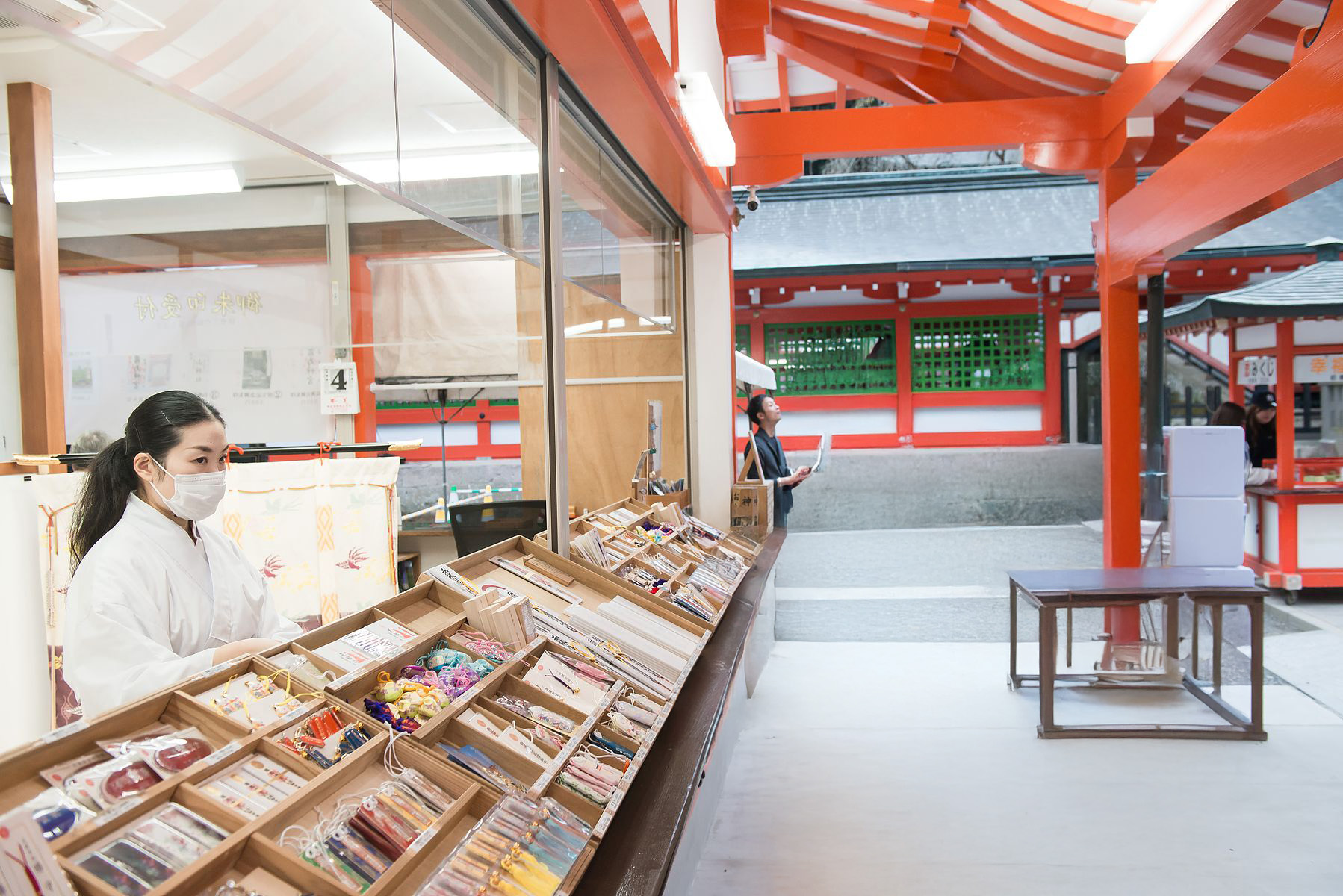 혼덴(本殿, 본전) 옆에는 기원(祈願)하는 내용이 담긴 갖가지 오마모리 (お守り / 御守り, 부적)들을 판매하고 있습니다. 대표적인 내용들은 학업성취, 합격기원, 교통안전, 건강기원, 연애 및 결혼, 금전운, 출산 및 순산 등입니다.