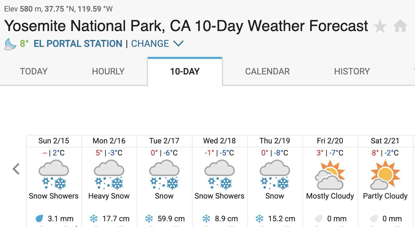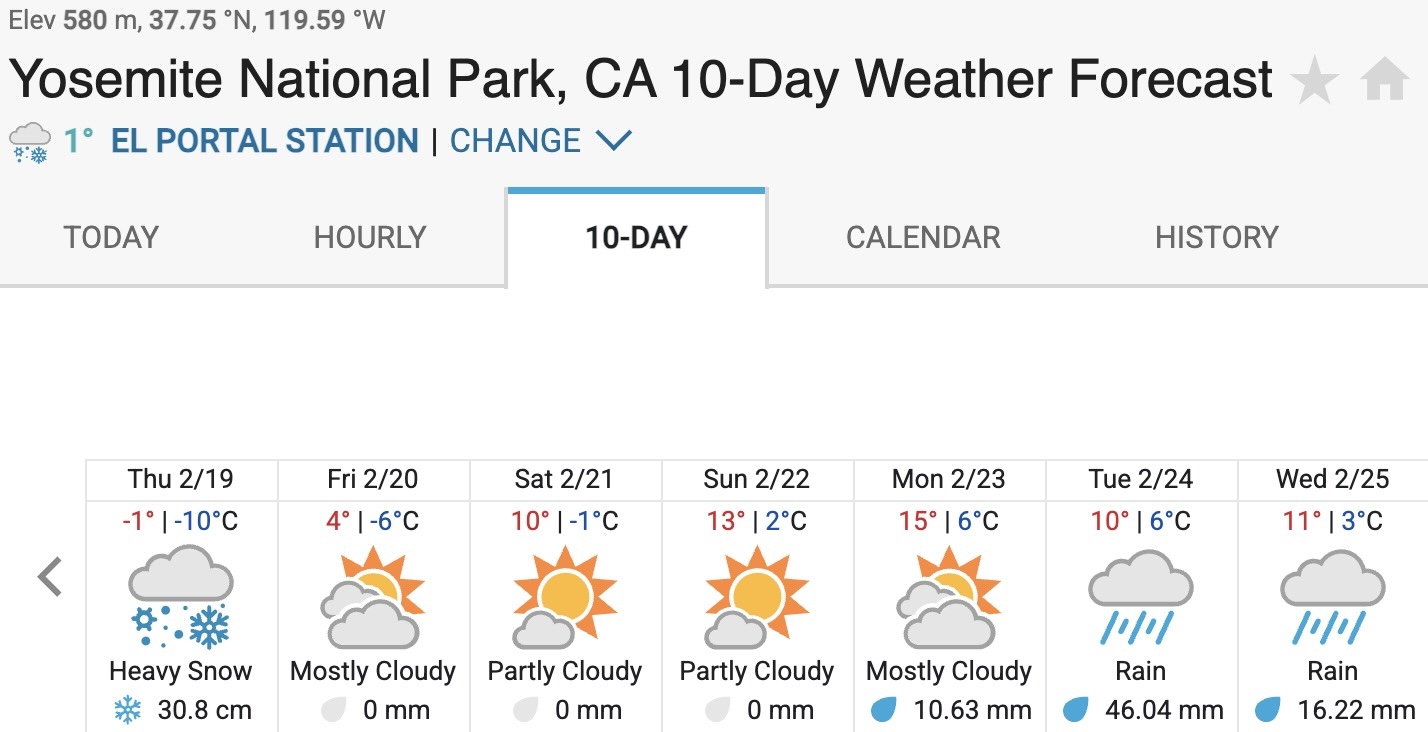 캘리포니아의 눈이 내리지 않는 동네에 살고 있지만, 눈을 너무 좋아합니다. 그래서 겨울이 되면 차를 타고 동쪽으로 4시간 가면 나오는 시에라 네바다 (Sierra Nevada) 산맥에 혹 눈을 보러갈 수 있을지 일기예보를 보곤 합니다. 과거에는 12~2월이 우기였는데 이번 겨울은 이른 비가 내린 후 한달 넘게 비가 내리지 않아 우기가 완전히 끝난줄로 생각하고 있던 중, 지난 일요일부터 다시 많은 비가 내리고 기온이 떨어지기 시작했습니다. 요세미티 국립공원 일기예보를 보니 5일간 적설량이 1m 넘을 것으로 보였습니다. 2023년에도 눈이 엄청 왔는데 너무 와서 공원을 며칠간 폐쇄하는통에 결국 가지 못했습니다.
