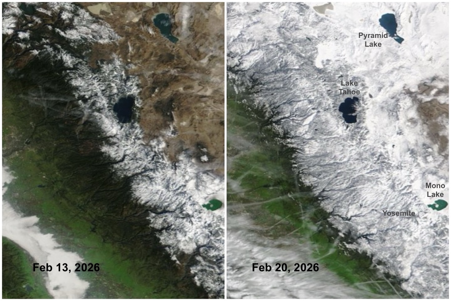 아래는 1주 전과 이날의 NASA 항공 사진 비교. 눈사태로 9명이 사망한 Lake Tahoe 인근의 스키 리조트들은 적설량이 2.8m을 넘었습니다.