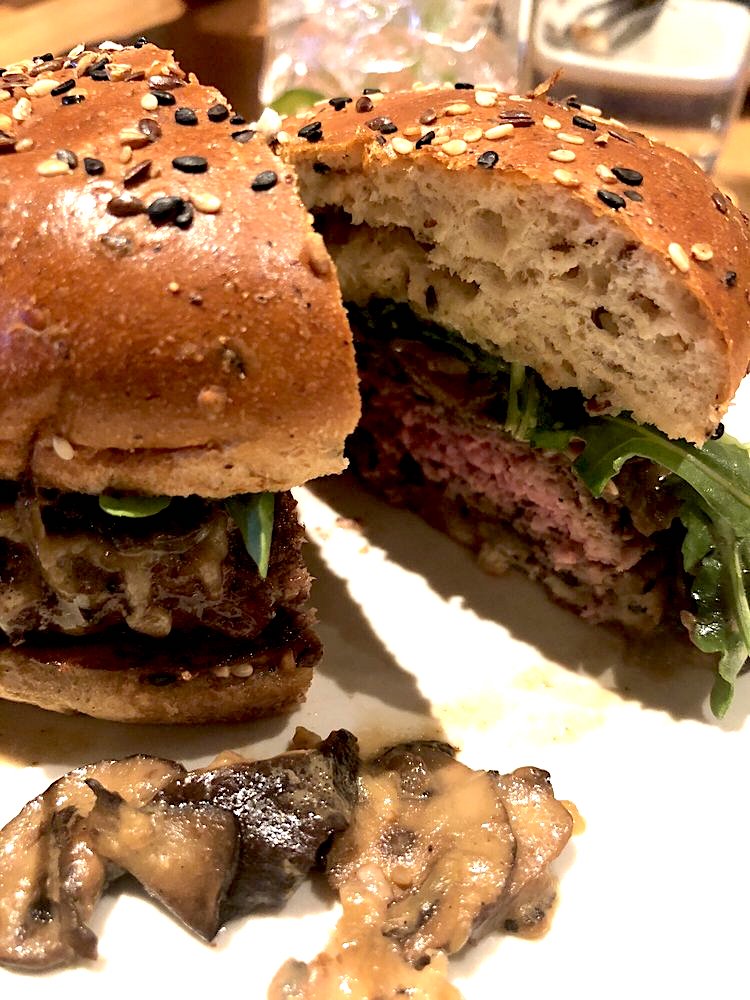 반면 오늘 먹은 True Food Kitchen의 버거는 무척이나 담백한 맛 이었습니다. 화려함보다는 우아함(?)이랄까요? 아마씨(flaxseed)가 숭숭 박힌 번(bun) 안의 기본 속 재료들을 보면 양송이 버섯 볶음, 카라멜라이즈한 양파, 아루굴라(arugula) 이파리, 약간의 파르메산 치즈(parmesan cheese), 마요네즈가 전부입니다.