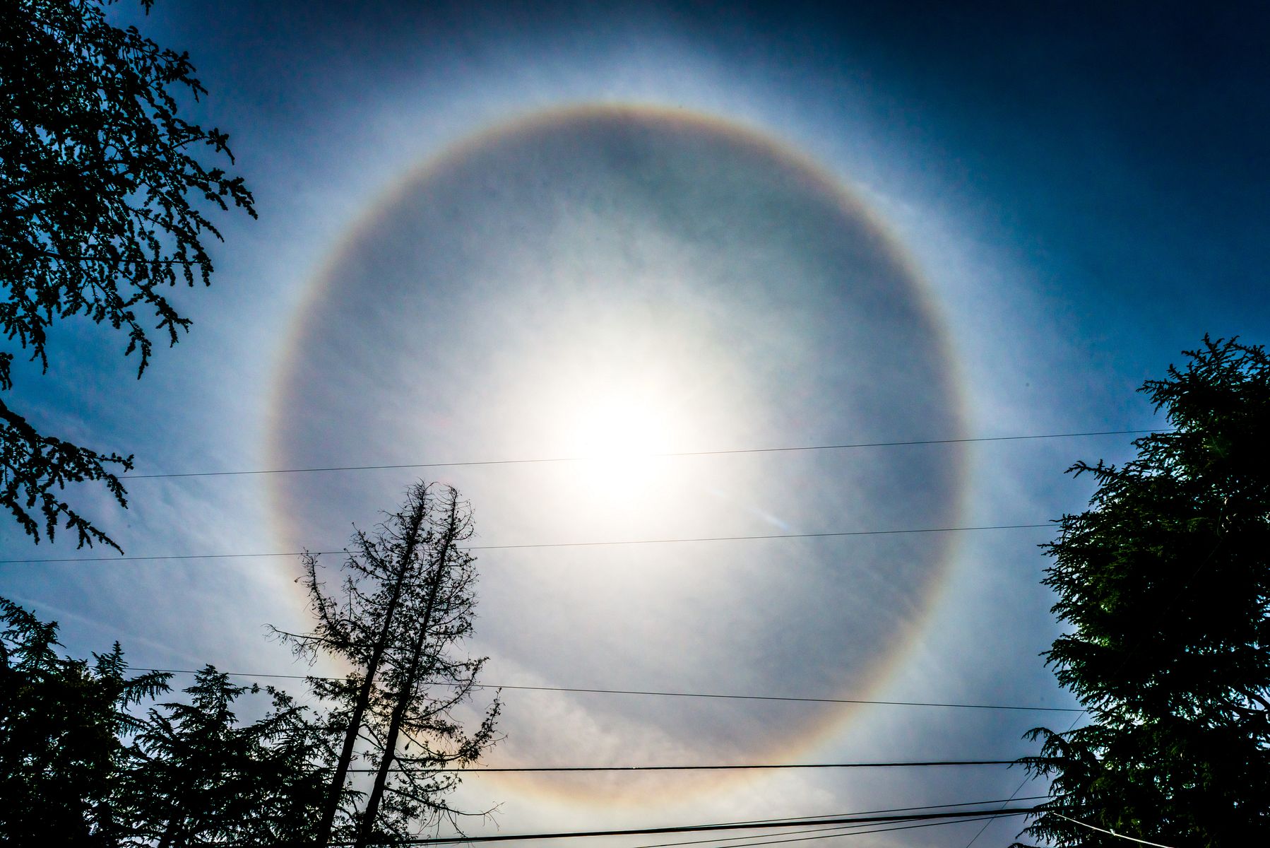밝은 보름달이 뜬 날이면 늘 하늘을 쳐다보곤 해서 달무리(lunar halo)는 가끔 볼 기회가 있었는데, 대낮에 해를 쳐다볼 생각은 안하는지라 해무리 (solar halo)라는 것은 듣기만 했지 한 번도 본적이 없었습니다. 같은 동네 지인이 해무리가 생겼다고 카톡을 보내왔길래 한번 찍어봤습니다. 생기는 원리가 무지개와 동일하게 공기중 수분으로 인한 빛의 산란 현상이라 일명 원형 무지개라고도 부르더군요. (실제로는 너무 눈 부셔서 이렇게 색깔이 보이지는 않아요)