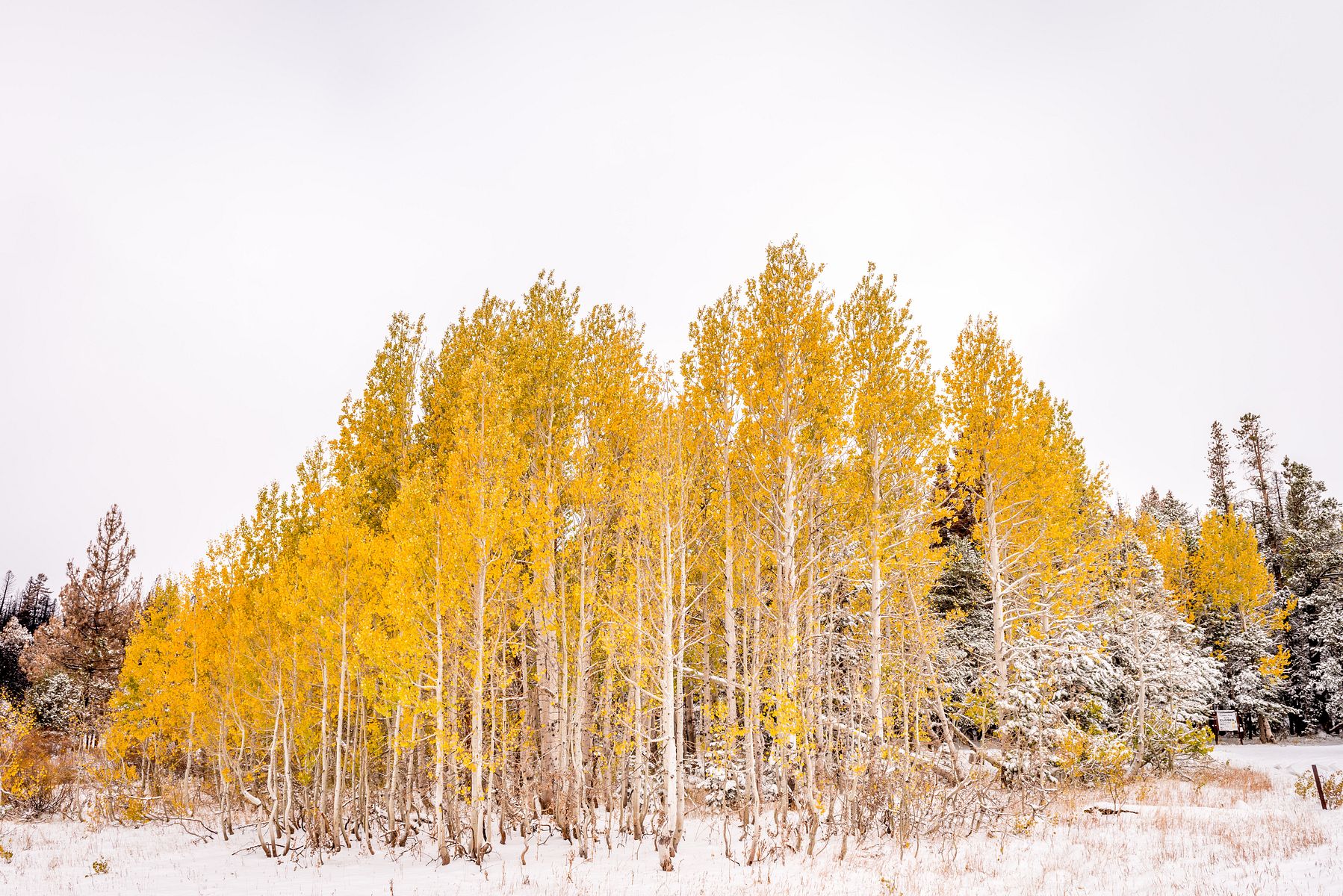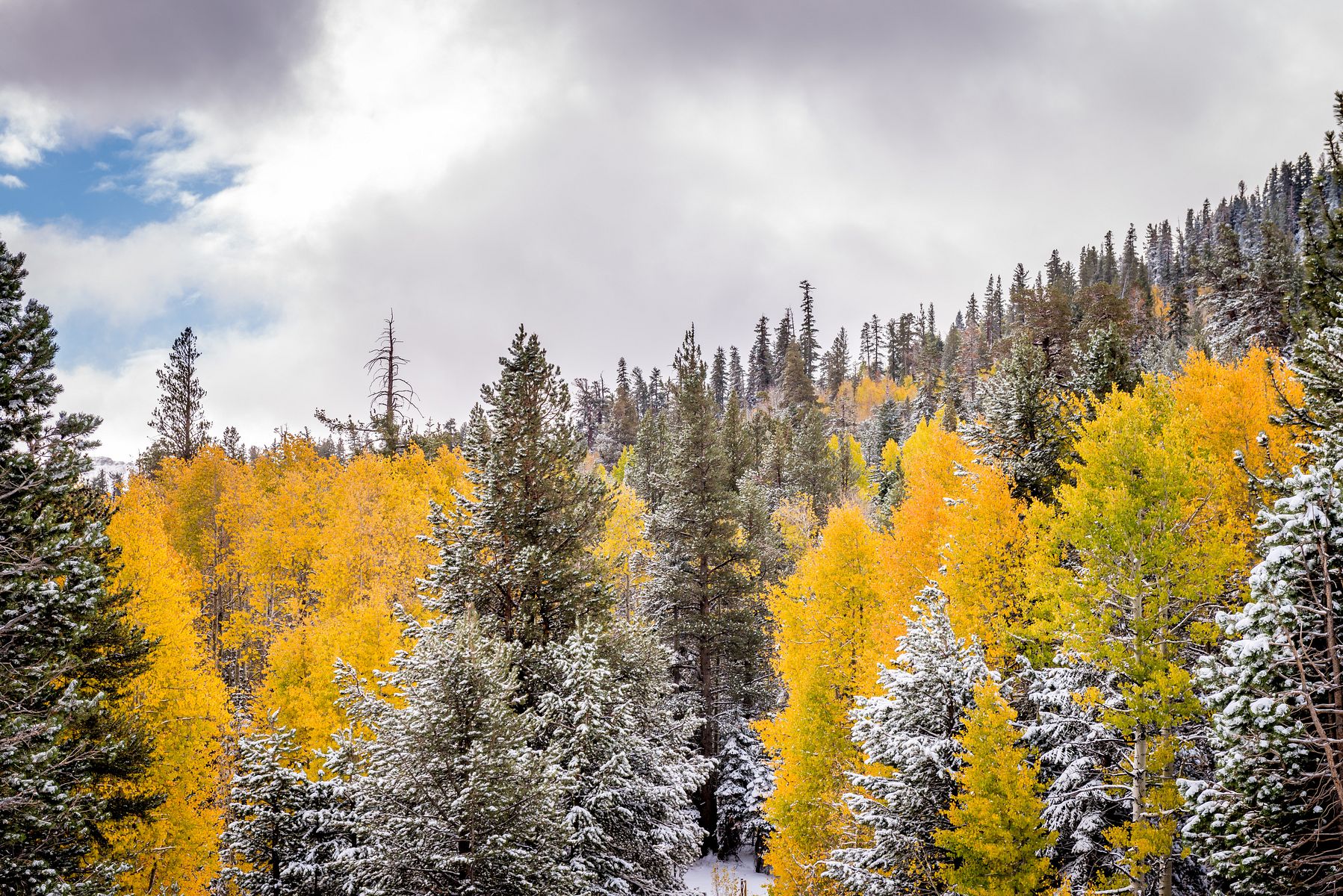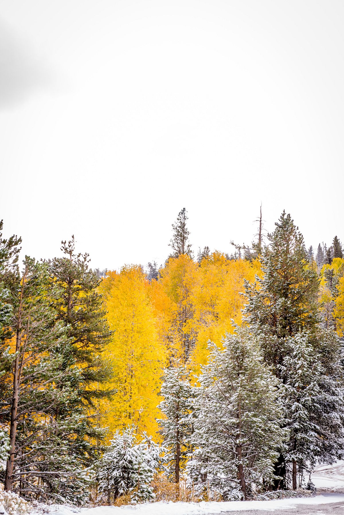실버 레이크를 지나 조금 더 가다보니 사시나무 (aspen) 들이 예쁘게 물들어, 눈 덮인 소나무 (pine) 숲속에서 자태를 뽐내고 있습니다.