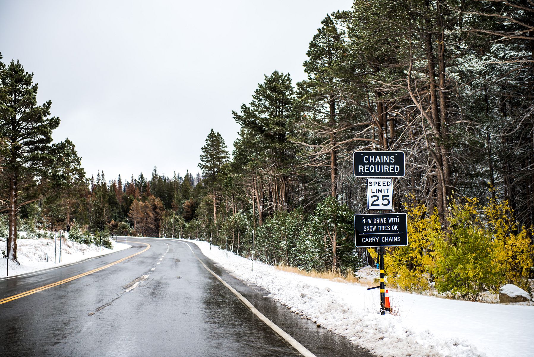 10월인데 눈이 와서 체인이 필요하다는 표시가 있습니다. 다행히 온도가 영상이고 밤새 눈을 잘 치워서 체인을 실제 장착할 필요는 없었습니다.