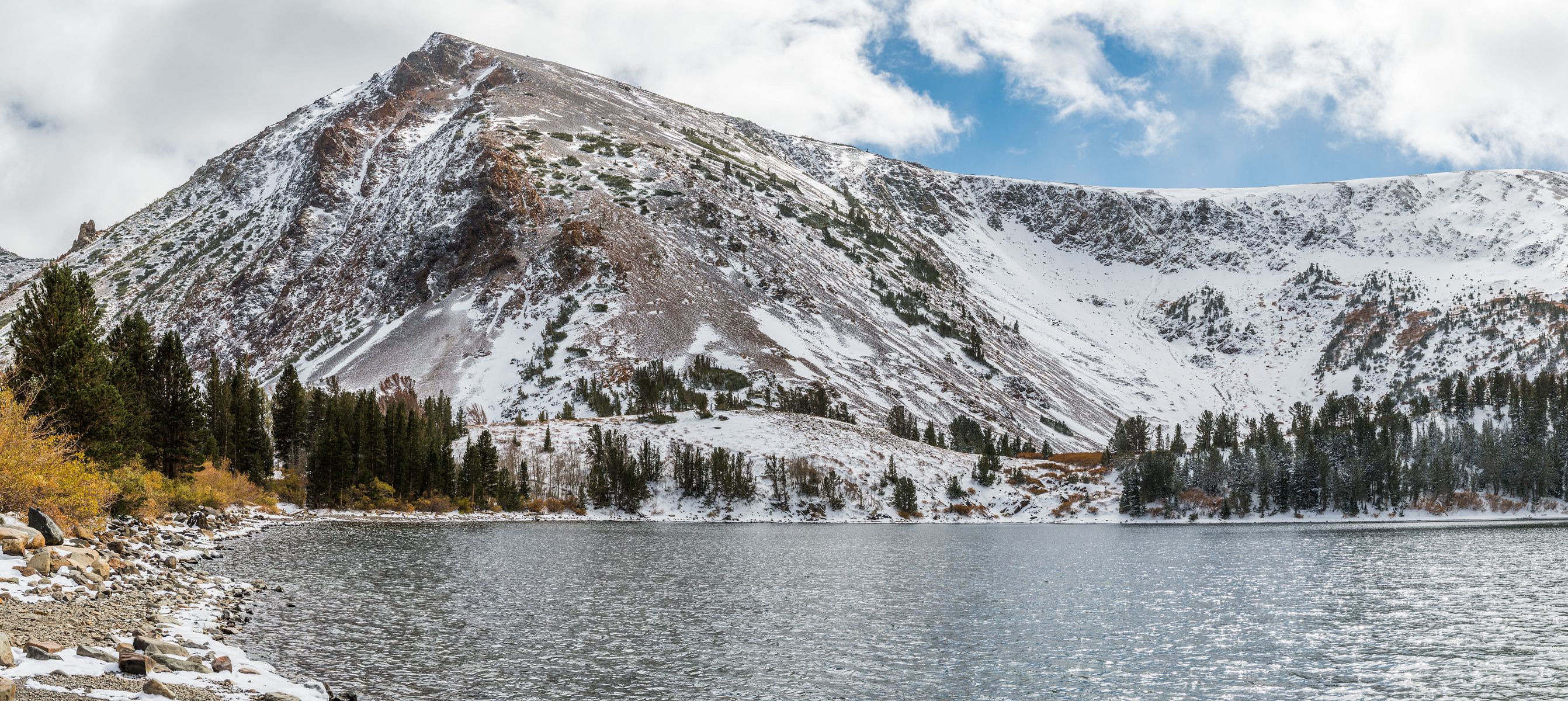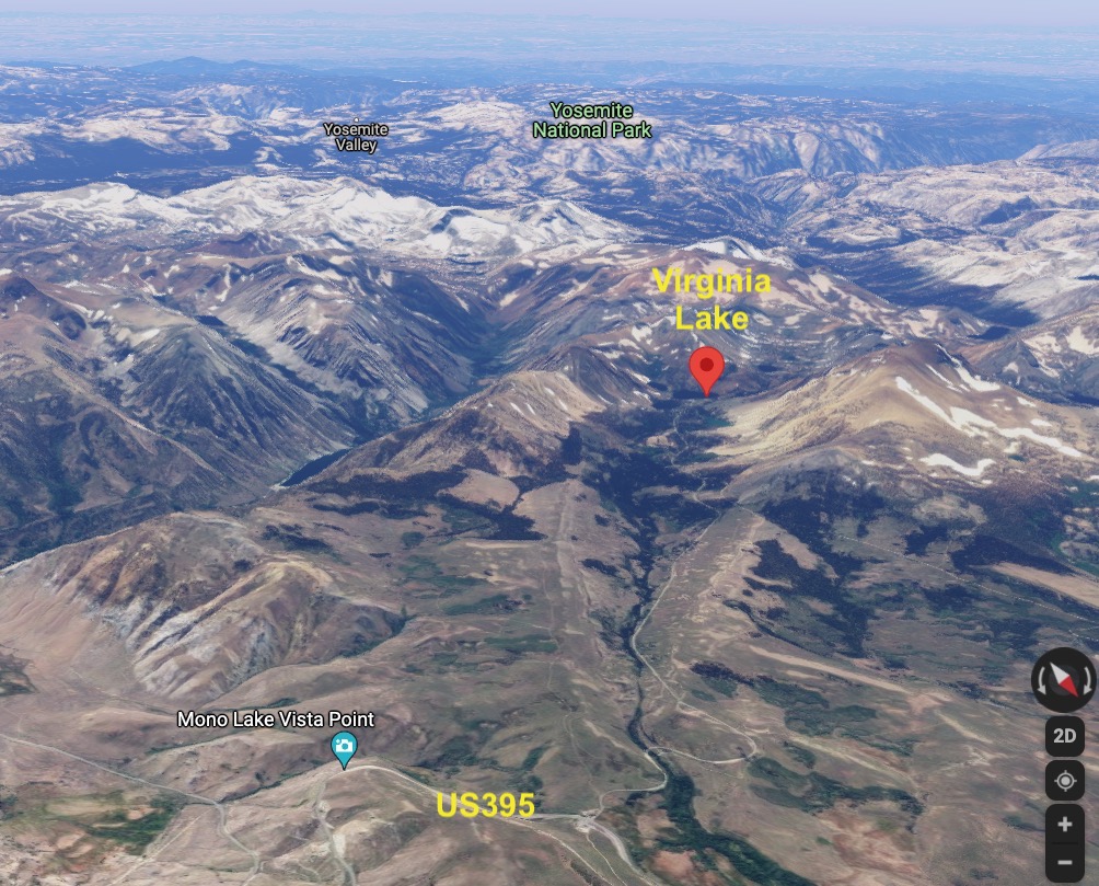정오가 이미 지났지만 모노 레이크 옆의 Lee Vining까지는 가야 먹을만한 식당이 있을 것 같아 가는 길목 북쪽에 위치한 버지니아 레이크 (Virgina Lakes) 한 곳만 들르고 점심을 먹기로 결정을 했습니다. 고도 9,819 ft (2,993 m) 의 고지대에 위치한 호수라서 시기가 잘 맞으면 설산의 배경으로 한 가을 나무를 찍을 수 있을까 싶은 기대를 했지요. US395 고속도로에서 약 10Km 를 산쪽으로 올라가는데요, 거의 끝까지 포장도로이고 맨 끝에 있는 약간의 비포장도로도 상태가 좋아 승용차로 충분히 갈 수 있습니다. (아, 람보르기니 같은 스포츠 카로는 가지 마세요 😜 )
