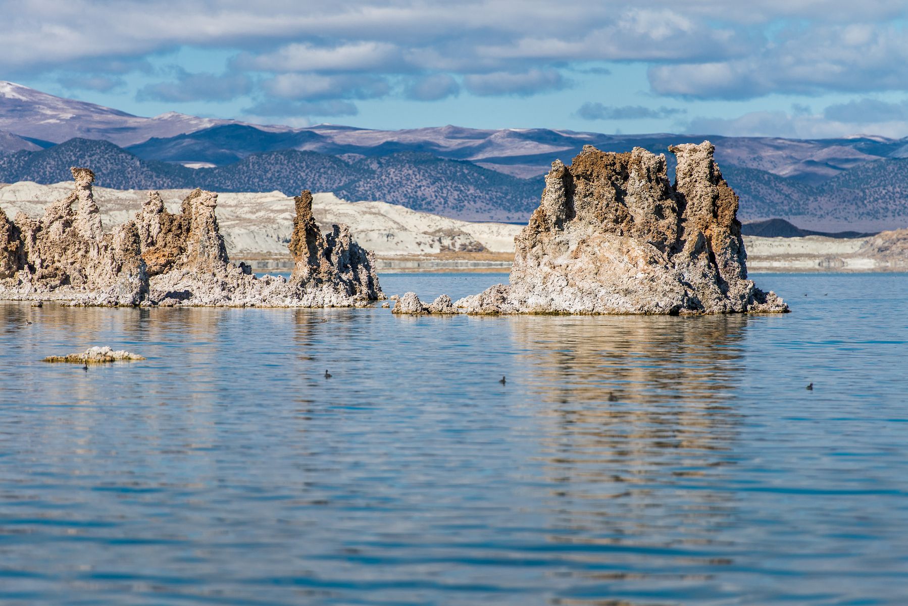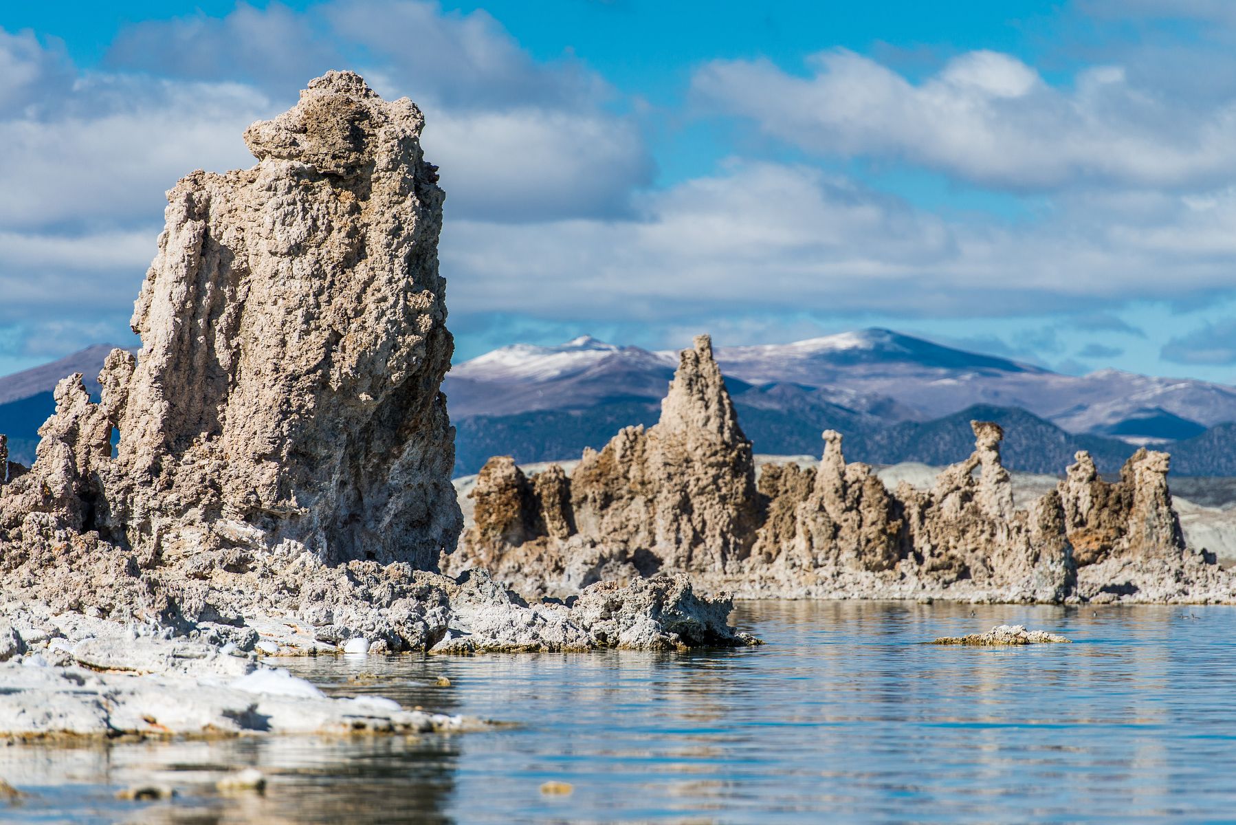 이곳의 주 된 볼거리는 석회석 돌기둥들입니다. 유입되는 물이 방출되지 않아 염도가 상당히 높은지라 투파 (tufa) 라고 부르는 석회석 (limestone) 돌기둥이 호수 곳곳에서 자라납니다.