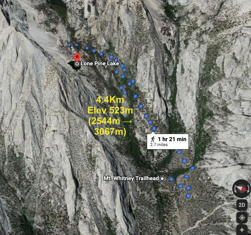 경로는 아래와 같습니다. 비숍 (Bishop) 숙소에서 아침 일찍 출발해서 오전 내로 산행을 마치고 오후에는 쉬는 것으로 일정을 잡았습니다. 가장 가까운 도시인 론 파인 (Lone Pine) 에도 저렴한 모텔들이 있습니다. 마운트 휘트니 트레일헤드 (Mt Whitney Trailhead) 까지 도로가 잘 닦여 있습니다.