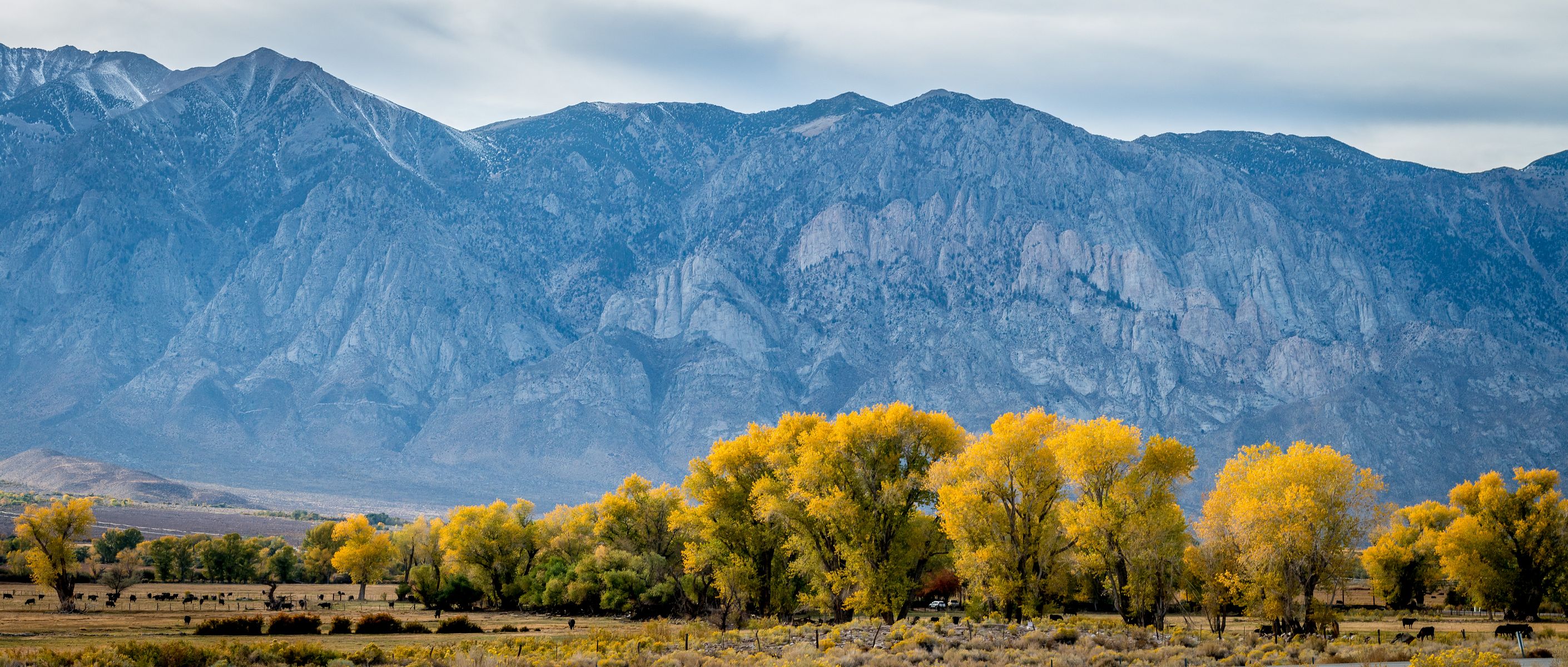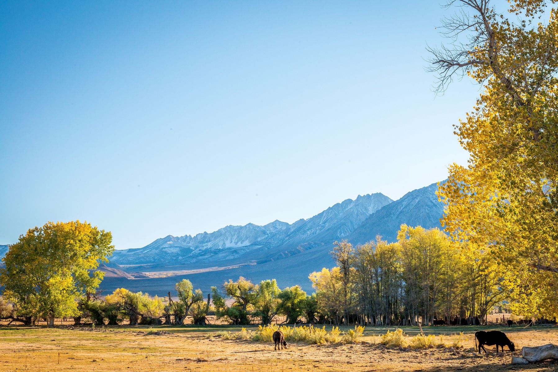 인요 국유림 동쪽 골짜기를 따라 워싱턴 주에서 남가주까지 US-395 고속도로가 연결되는데요, 모노 레이크 (Mono Lake)에서 비숍 (Bishop) 으로 가는 길에 비숍 북쪽 16Km 의 라운드 밸리 (Round Valley)를 지나는데, 노랗게 물든 숲의 모습이 너무도 매혹적이었습니다. 호수가라면 금상첨화겠지만, 가을색이 물든 숲과 목초지만으로도 너무 멋져서 고속도로 변에 차를 세우고 한참을 보았습니다.