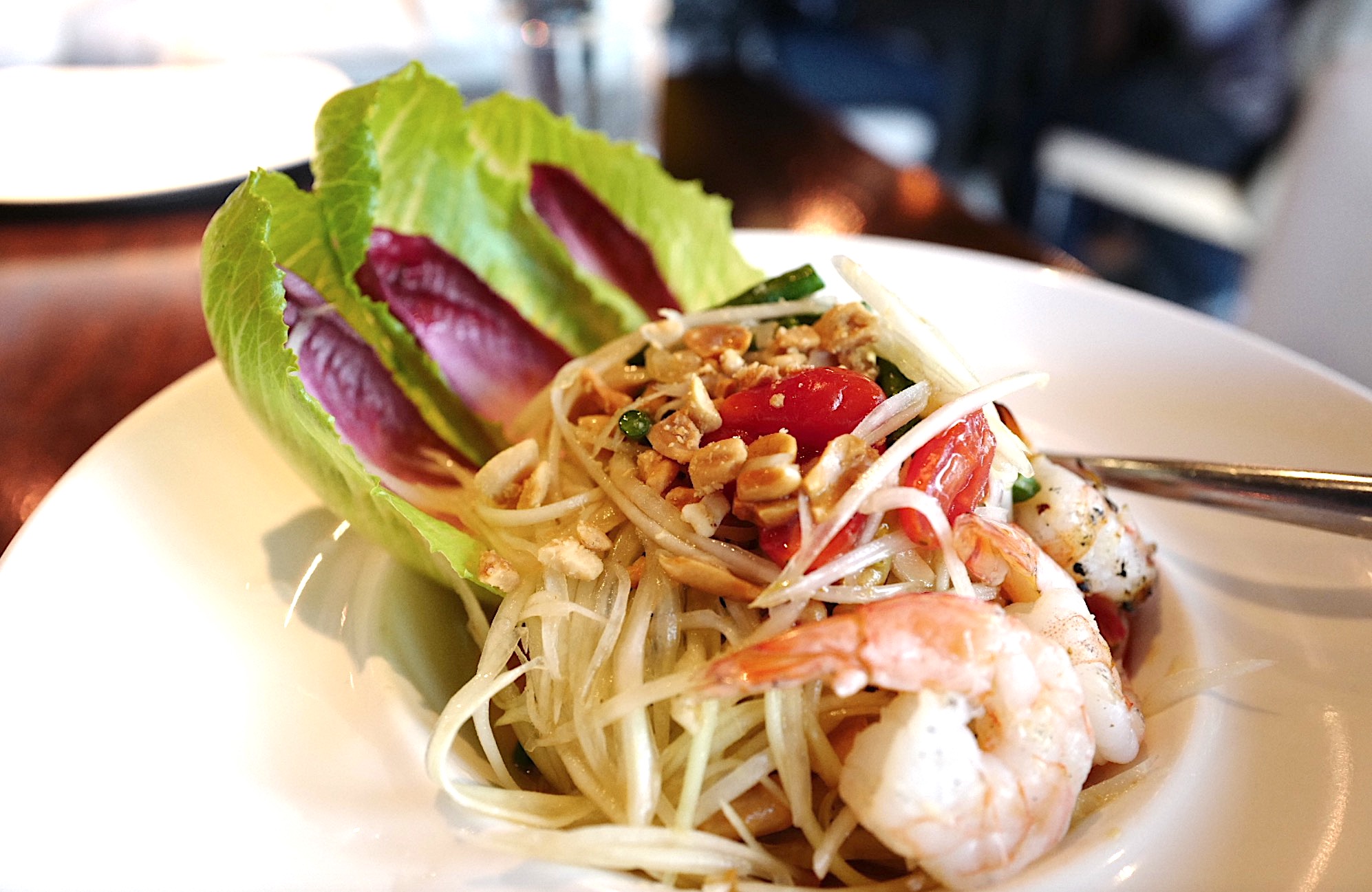 "파파야 샐러드 (Papaya Salad)" 이 음식이 제일 오리지날 타이 음식에 가까왔네요. 보는 그대로 파파야 채에 새우 구운것과 땅콩과 타마린/라임 드레싱을 살짝 뿌려 나왔습니다.