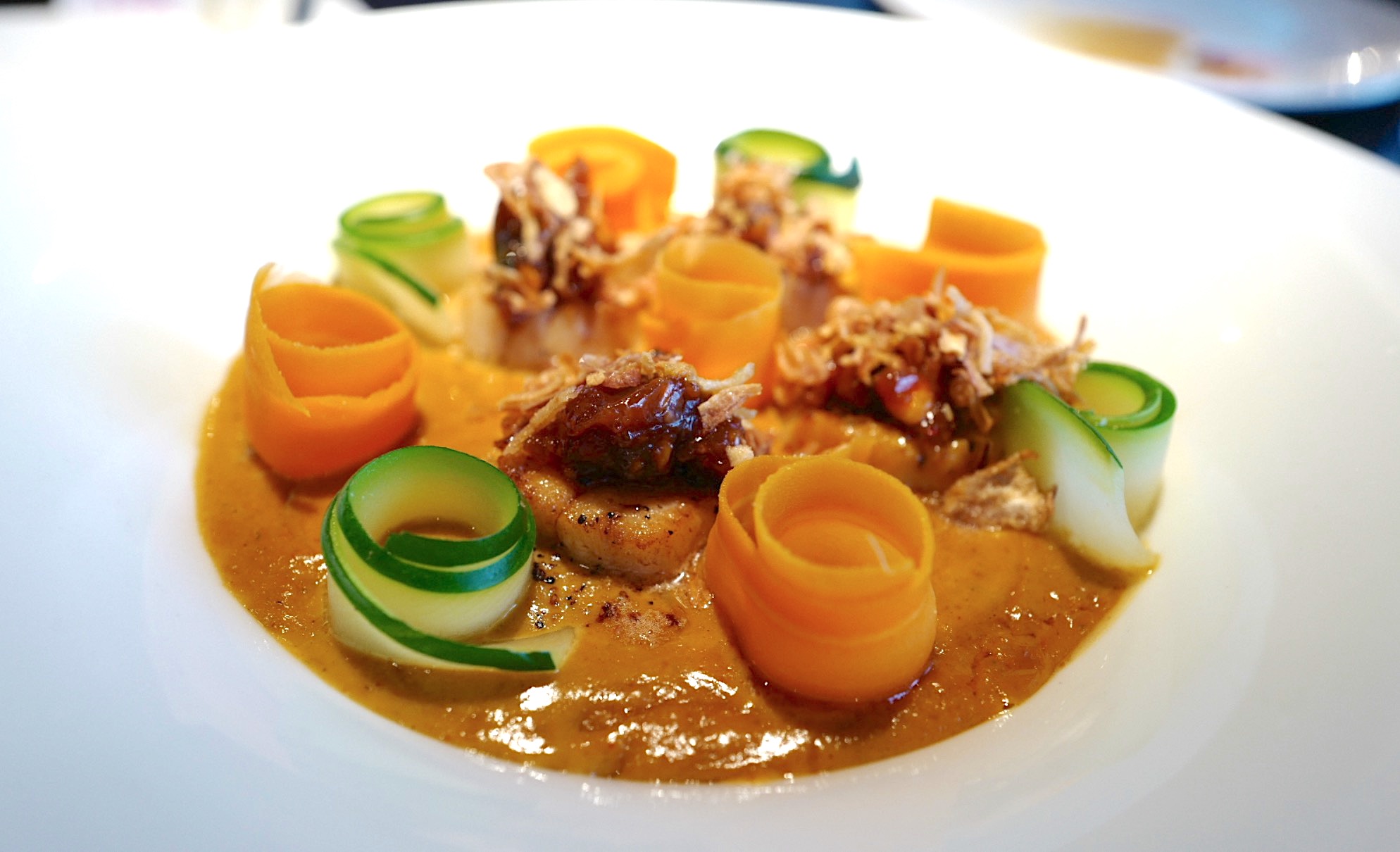 "완전 가리비 (Totally Scallop)" 진한 커리+땅콩 소스를 바닥에 깔고 가리비 관자와 캐슈넛 (cashew nut) 을 볶은 것을 올려 나왔습니다. 오이 당근 데코레이션은 예쁜데 가리비 좀 더 줬으면... 😜