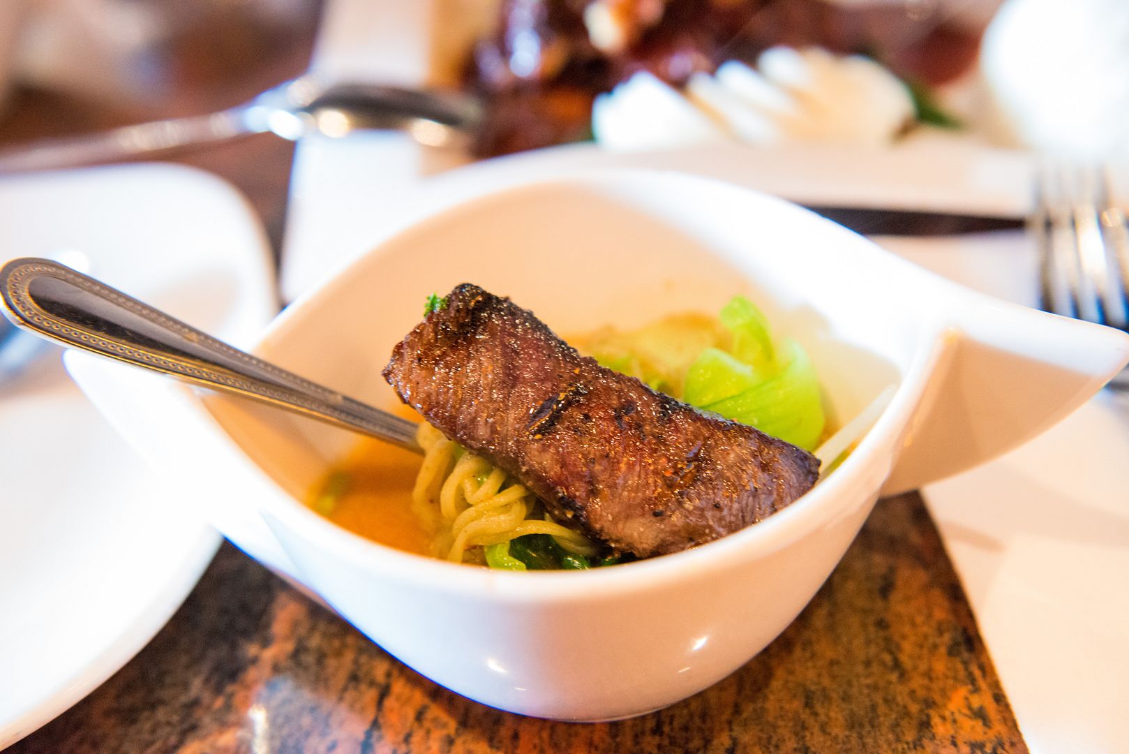 "구운 고베 스테이크와 얼큰한 일본된장 국수 (Grilled Kobe Steak & Spicy Miso Noodle Soup)" $17.95. 일본풍 국물에 타이 계란국수 (egg noodle)을 접목해 만들었습니다. 스테이크 양 생각하면 가성비 아주 훌륭하고 아주 맛있어서 갈 때마다 주문하곤 합니다.