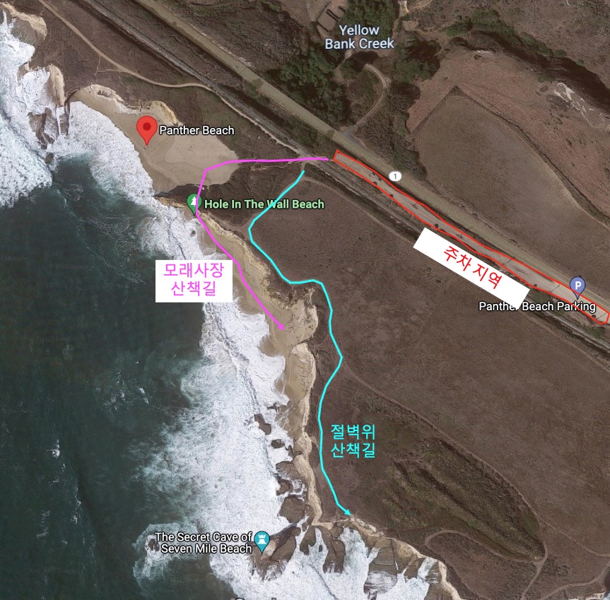 유일한 통로인 이 구멍을 경계로 북쪽이 Panther Beach, 남쪽이 Hole-in-the-Wall Beach인데요, 썰물때면 지나갈 수 있으나, 밀물때는 지나갈 수 없게 될 수 있으니 유념하셔야 합니다. 2017년에는 14명이 고립되어 헬리콥터로 구조한 일이 있었다고 합니다.